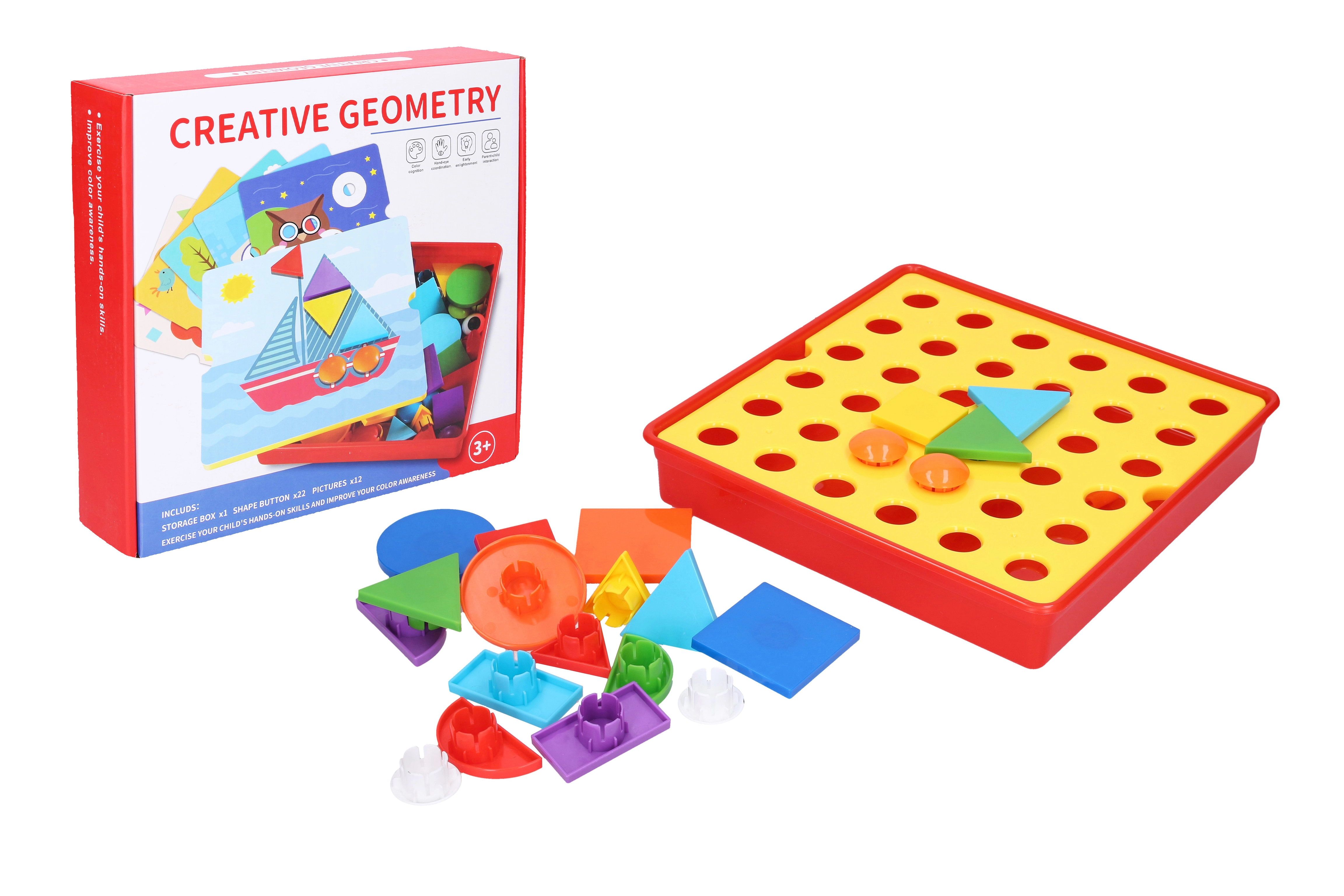 Tänu 22 värvilisele tükile ja 12 pildilise šablooni komplektile harjutavad lapsed kujundite äratundmist, käe-silma koostööd ja ruumitaju. Ideaalne koduseks mänguks ning sobib ka lasteaedadesse.