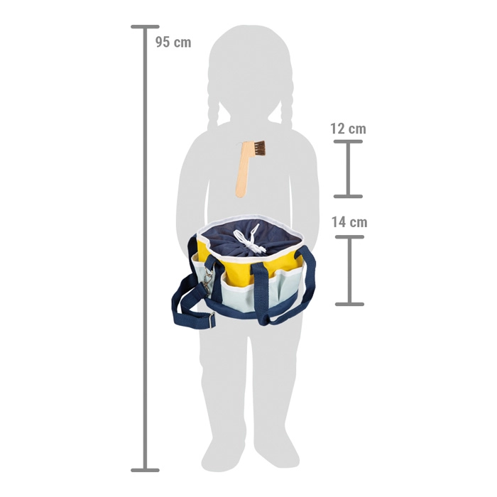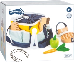 See kvaliteetne rollimängukomplekt võimaldab lastel hoolitseda oma lemmikhobuse eest nagu päris tallitöötajad. Lai tõmbkinnisega avaus hoiab kõik tarvikud kenasti koos, küljetaskud tagavad ülevaate ja kiire ligipääsu. Pakendis on puidust vahendid harjamiseks, kammimiseks ja kabjade puhastamiseks ning lisaks pidulikku meeleolu loov turniirilint.