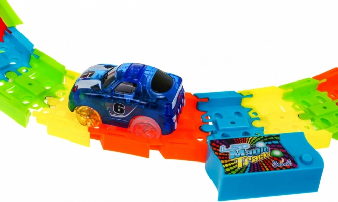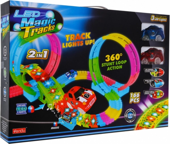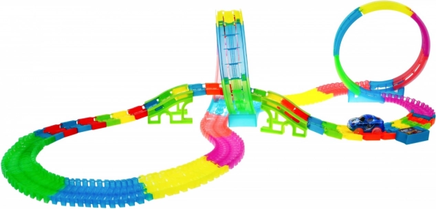Lõbus ja värviküllane võidusõidurada silmuste ja kallakutega pakub 3+ aastastele lastele tunde hoogsat mängu. Tänu fluorestsentsosadele helendab pimedas, sellel on LED-valgustus, sisseehitatud helipaneel ja kaks LED-auti efektselt valgusjälgedega sõiduks.