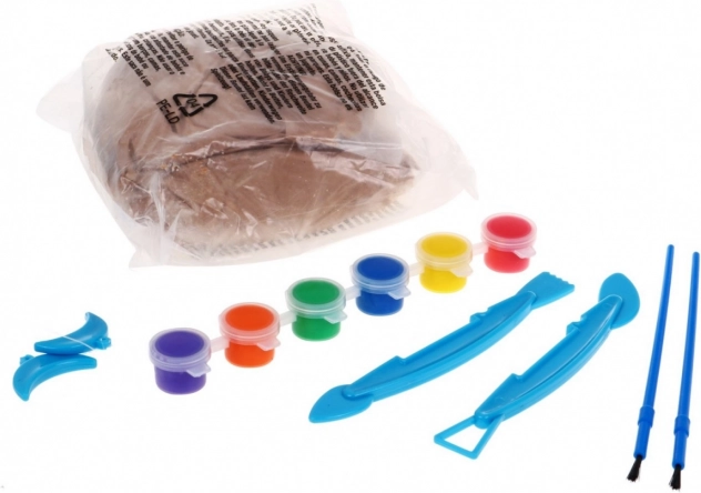 Kõik, mida lapsed vajavad: 800 g savi, 6 värvi, 2 pintslit, 2 skulptuuritööriista, lõikamisnöör käepidemetega ja praktiline hoidik.