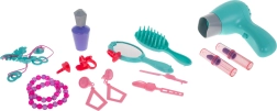 Komplektis on turvaline föön 1× AA patareiga, mis puhub õrnalt ja tekitab realistlikke helisid – ideaalne ilusalongi mänguks.