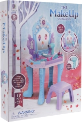 Komplekti kuuluvad taburet, ehted ja kosmeetikatarvikud – kõik turvalised ja väikestele kätele sobivad. Praktilised lahtrid laua ees ja külgedel hoiavad kõik aarded oma kohal.
