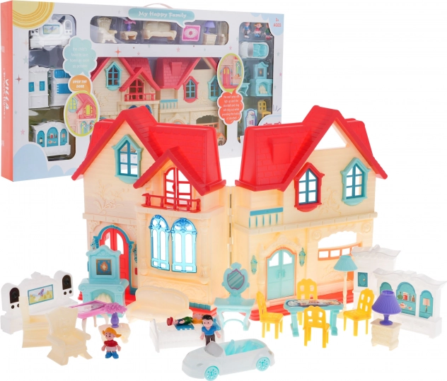 Komplekti kuulub rikkalik lisavarustus: mööbel elutuppa, magamistuppa ja kööki, dekoratsioonid, auto liikuvate ratastega ning kolm figuuri (ema, isa, laps). Tänu lihtsale kokkupanekule ja avatavatele ustele on mängimine mugav ja ülevaatlik.