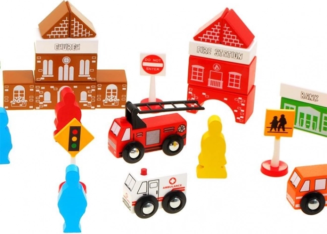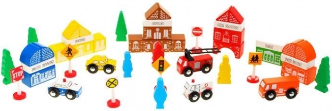 Klotsidel on meeldiv tekstuur ja need on sobiva suurusega väikestele kätele. Näited mõõtudest: hooned (u 3 cm x 6 cm x 3 cm), kiirabi (3,5 cm x 5 cm x 3 cm), tuletõrjeauto (5,5 cm x 8,5 cm x 3 cm), politseiauto (4 cm x 6 cm x 3 cm), figuurid (5 cm x 2,5 cm x 1 cm), liiklusmärgid (kõrgus 7 cm), valmistatud plastist.