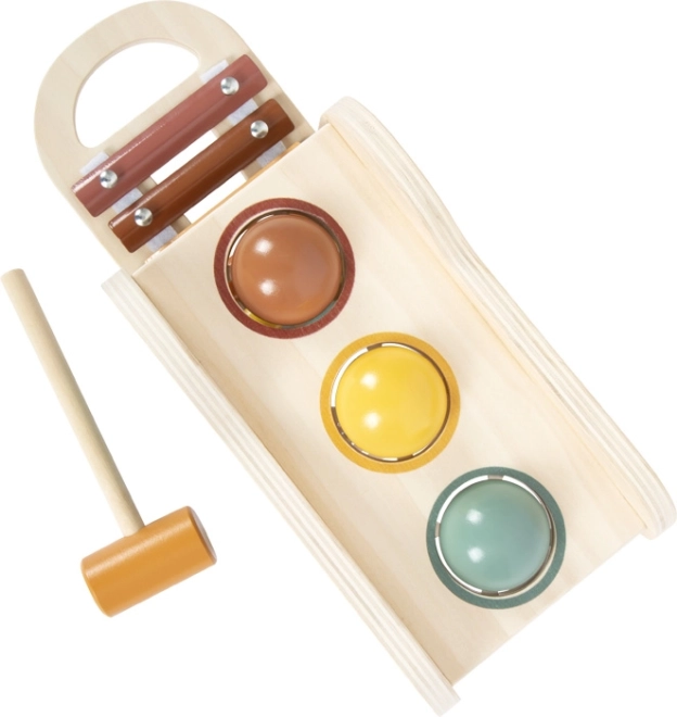 See puidust mänguasi ühendab multifunktsionaalse mängu kauni disainiga. Lapsed toksivad kolm värvilist palli haamriga läbi avade ning veeremine käivitab integreeritud ksülofoni helid. Muusikalise osa saab kergesti eemaldada ja kasutada eraldi – ideaalne esimesteks muusikalisteks sammudeks.