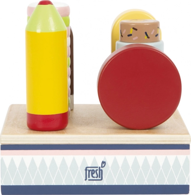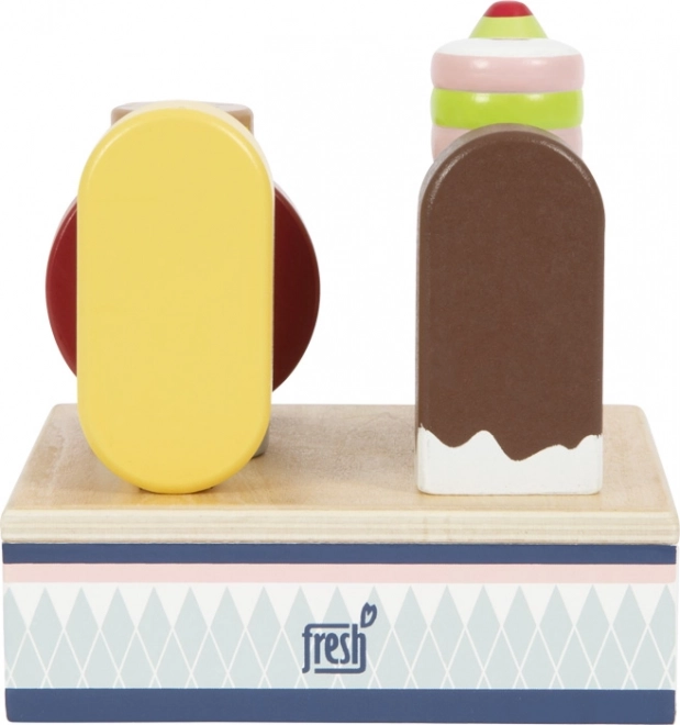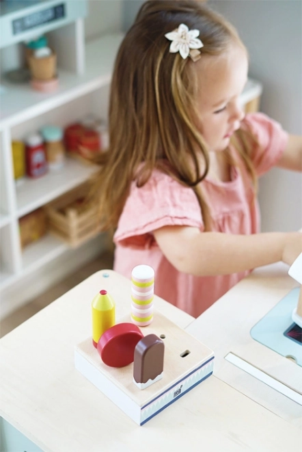 See puidust jäätisekomplekt sobib suurepäraselt mänguks poodi või kohvikusse. Tugev alus hoiab kõik kuus jäätist kenasti paigal, nii et väikesed käed saavad hõlpsalt valida lemmik“maitse” ja kliente teenindada. Tänu sertifitseeritud FSC-puidule on mänguasi mitte ainult kaunis, vaid ka loodussõbralik.