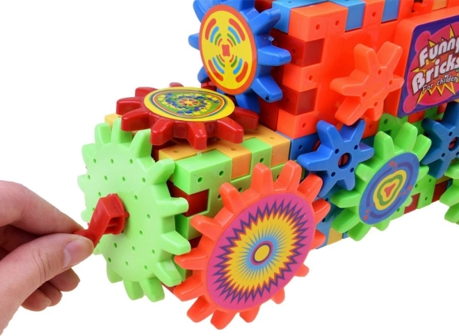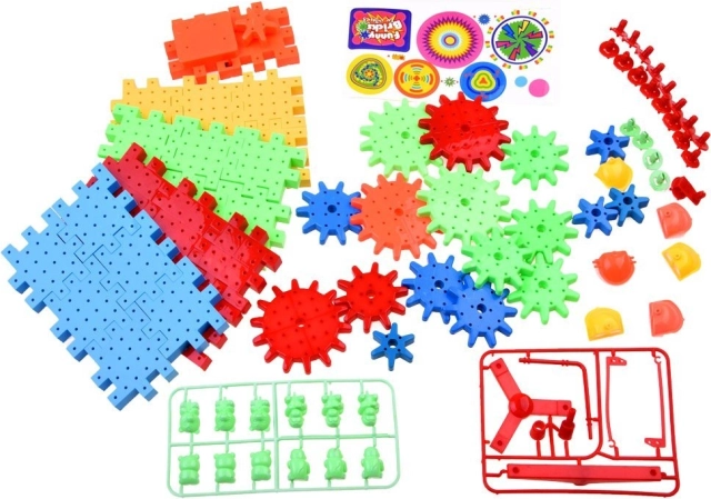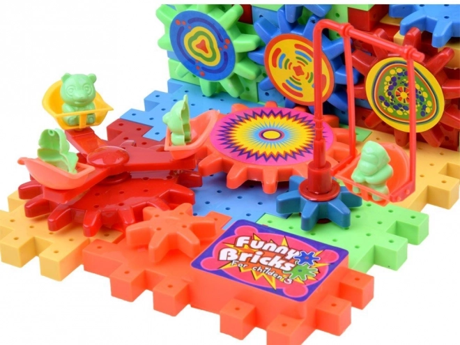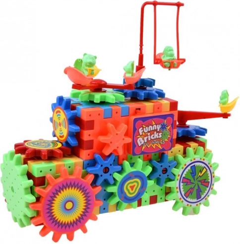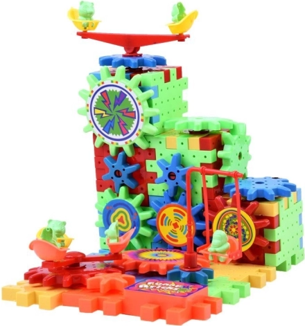 Komplekt sisaldab AA-patareiga töötavat hammasratast, millega lapsed saavad oma ehitisi elavdada.