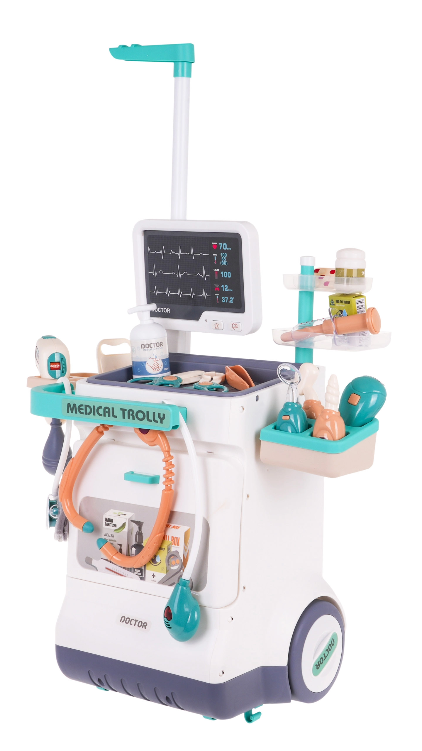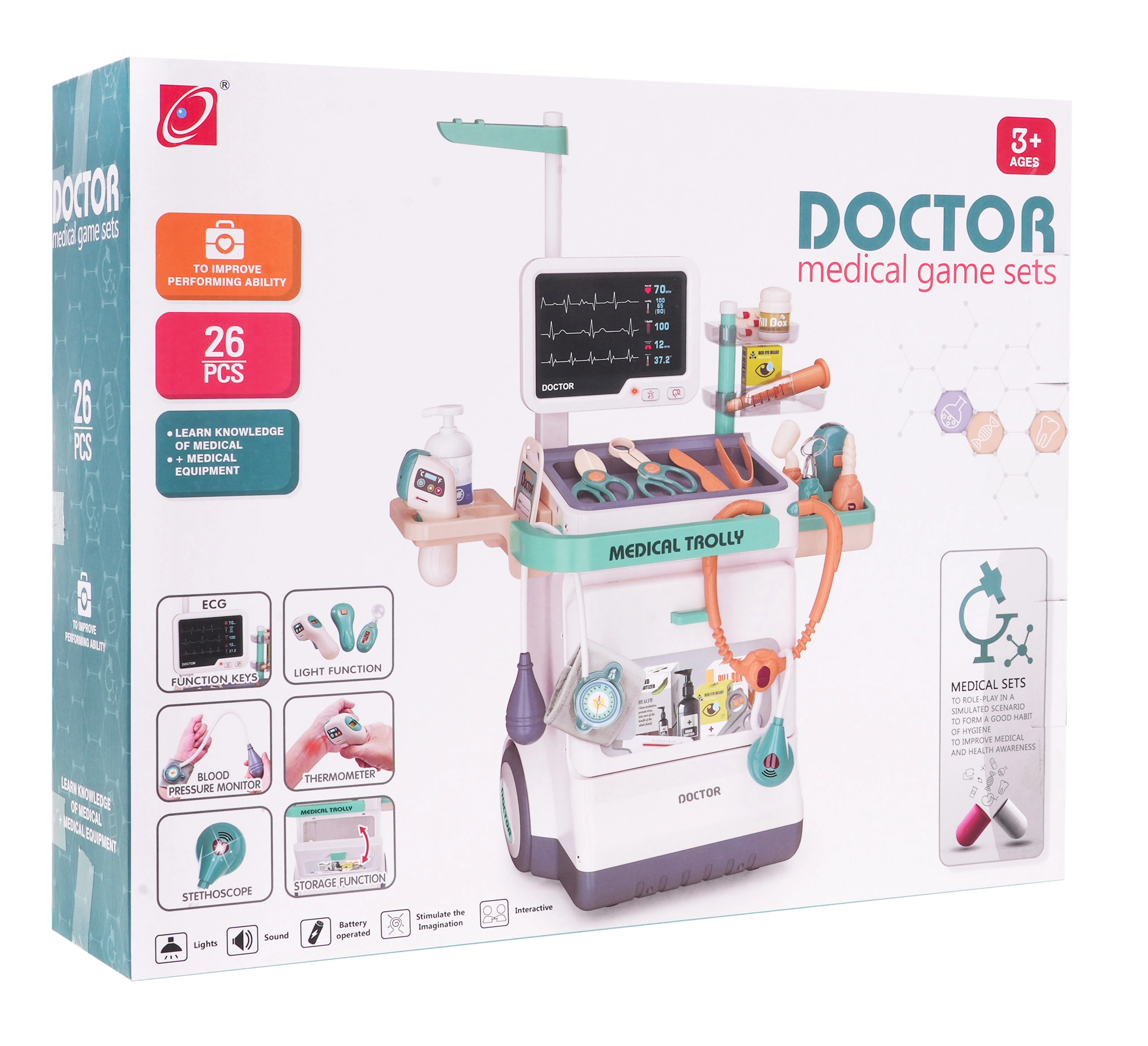 See interaktiivne arstikäru on täiuslik mängukomplekt, mis võimaldab teie lastel arstiks kehastuda. Komplektis on 26 meditsiinilist tarvikut, sh stetoskoop, termomeeter ja EKG-seade, mis pakuvad realistlikku ja lõbusat mängukogemust.