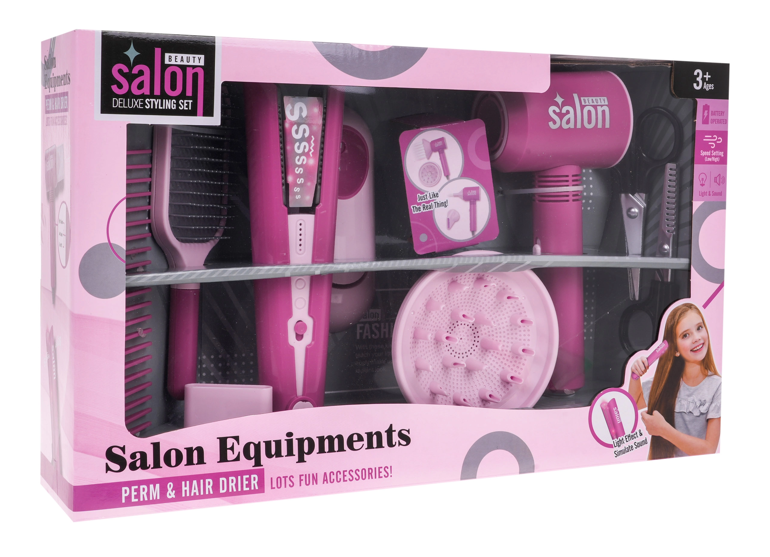 Avastage lõbus laste juuksurikomplekt väikestele stiiligurmaanidele alates 3. eluaastast. Komplekti kuulub patareidel töötav toimiv föön vahetatavate otsikutega ning juuksesirgendaja valguse ja helidega. Komplekt pakub rikkalikku lisavarustust, nagu käärid, kamm, hari ja hoidik. Föön puhub õhku, sellel on 2 võimsusastet ning see tekitab realistseid kuivatamishelisid. Valgus- ja heliefektidega sirgendaja lisab ilusalongimängule veelgi enam ehtsust.