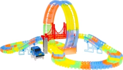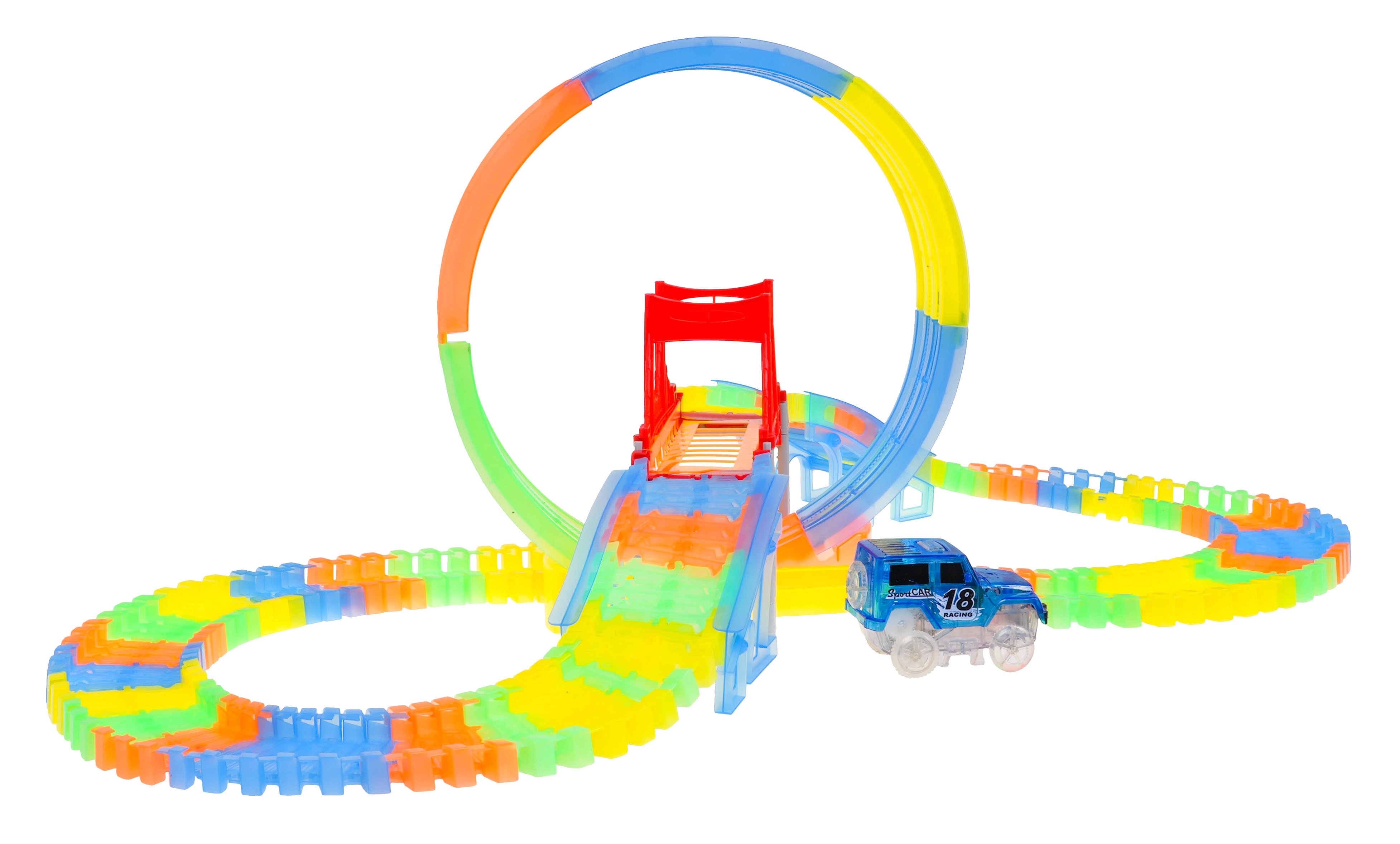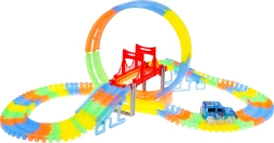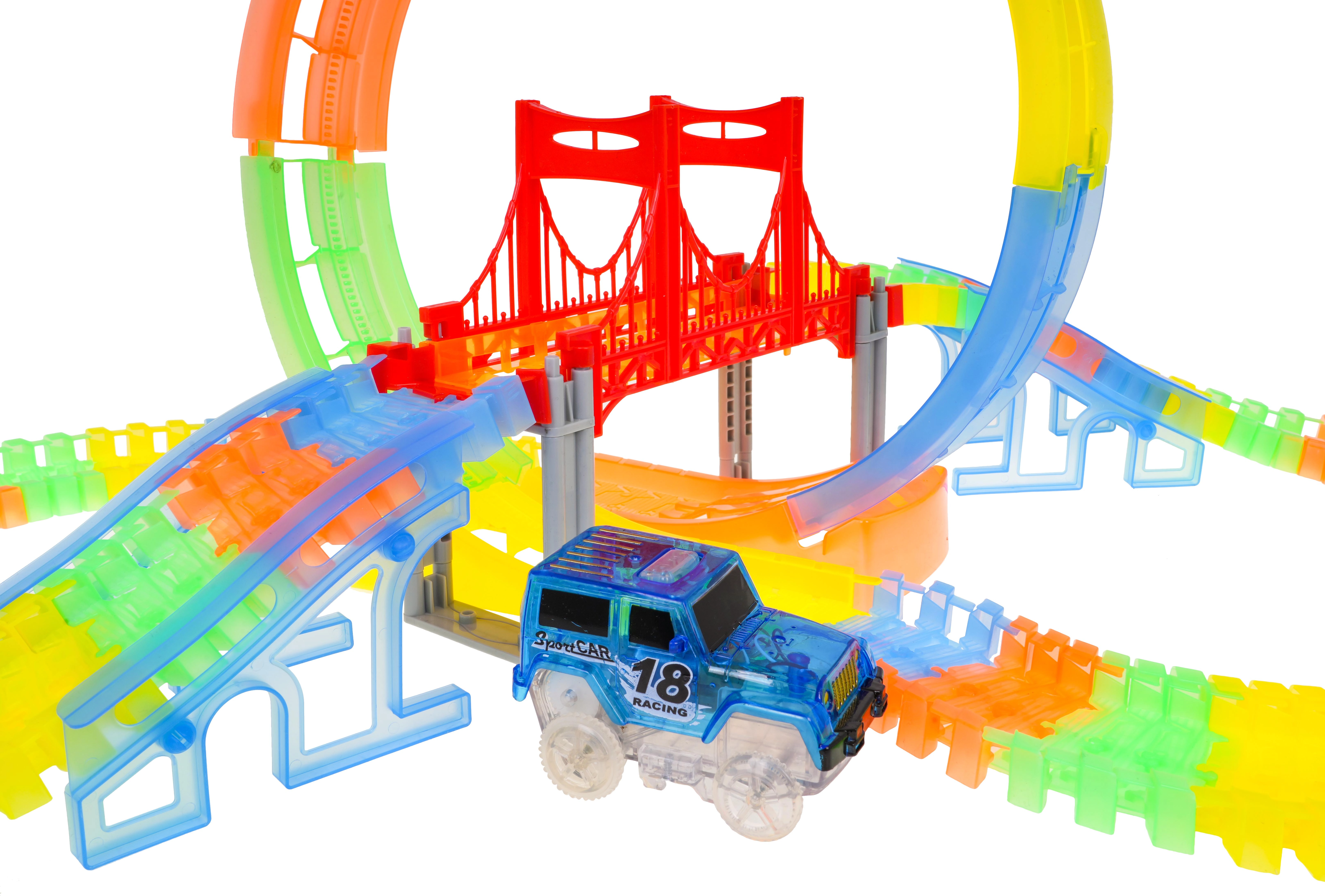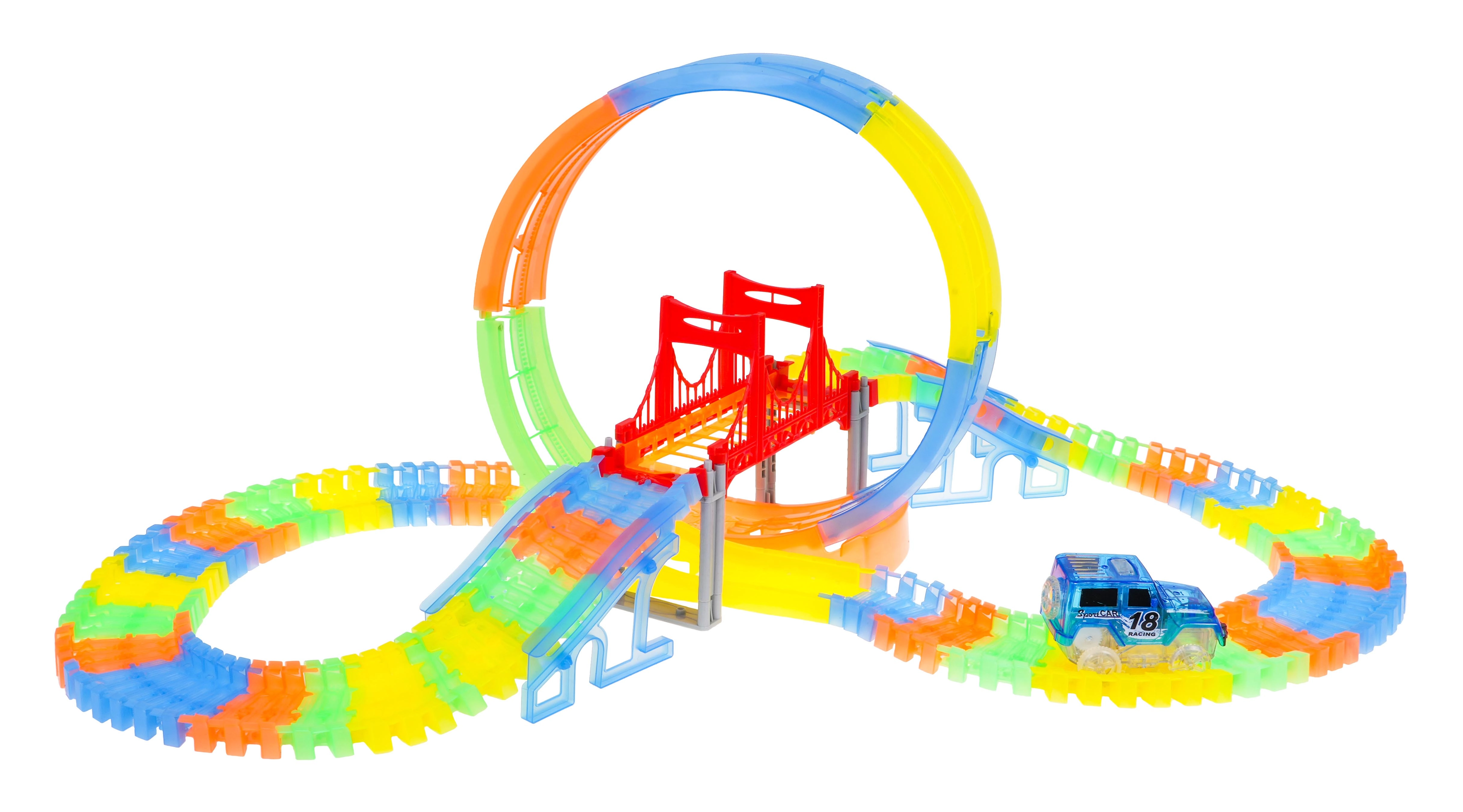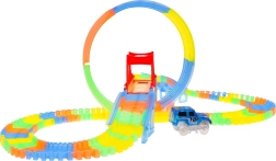 See värvikas võidusõidurada särab pimedas tänu fluorestseeruvatele osadele ja kaasas olevale LED-autokesele. Osad klõpsad lihtsalt kokku, saad neid pöörata, tõsta ja ümber paigutada ka sõidu ajal, luues uusi radasid koos 360° silmuse, sildade ja rampidega. Vaja on vaid vajutada nuppu auto katusel ja võidusõit võib alata!