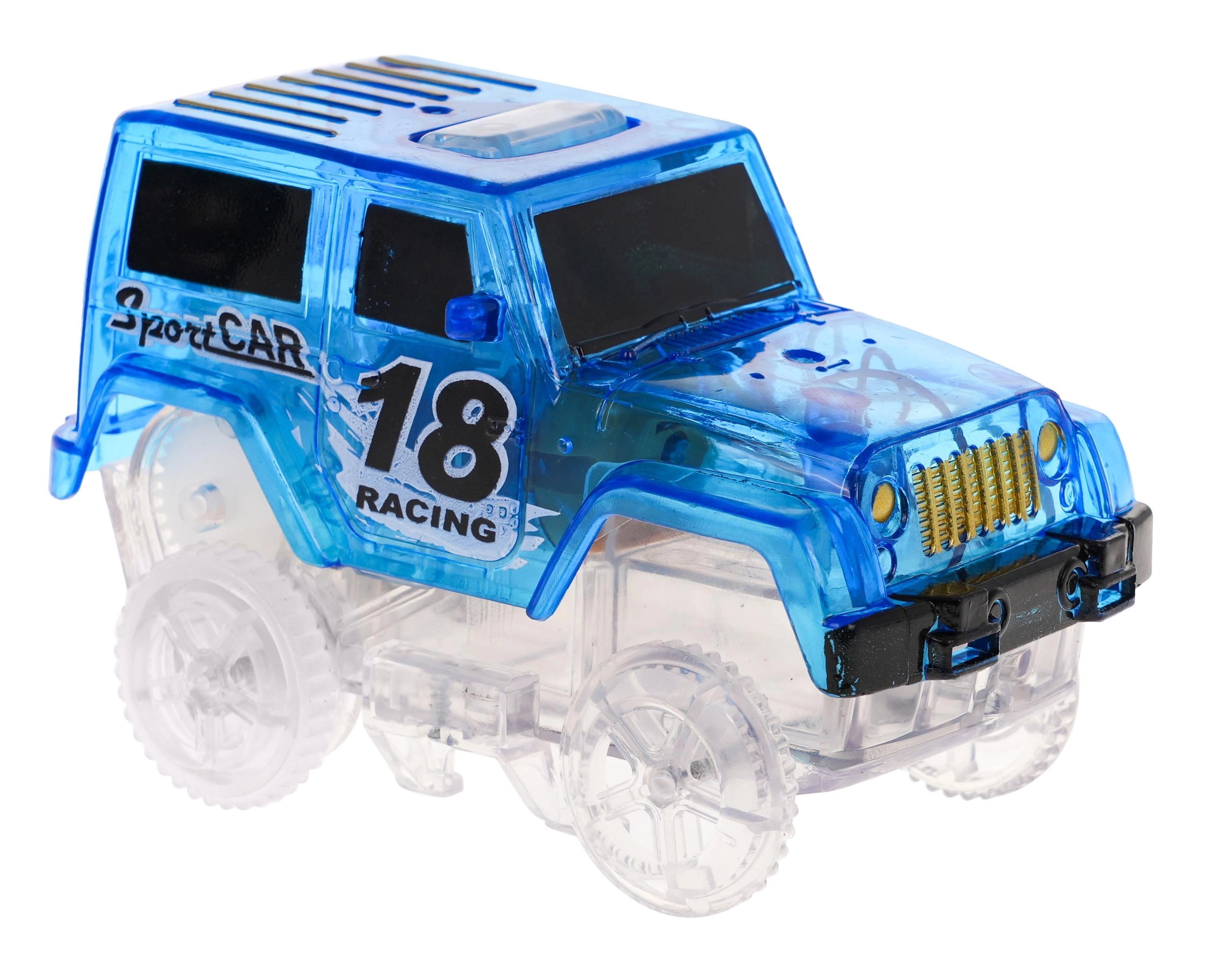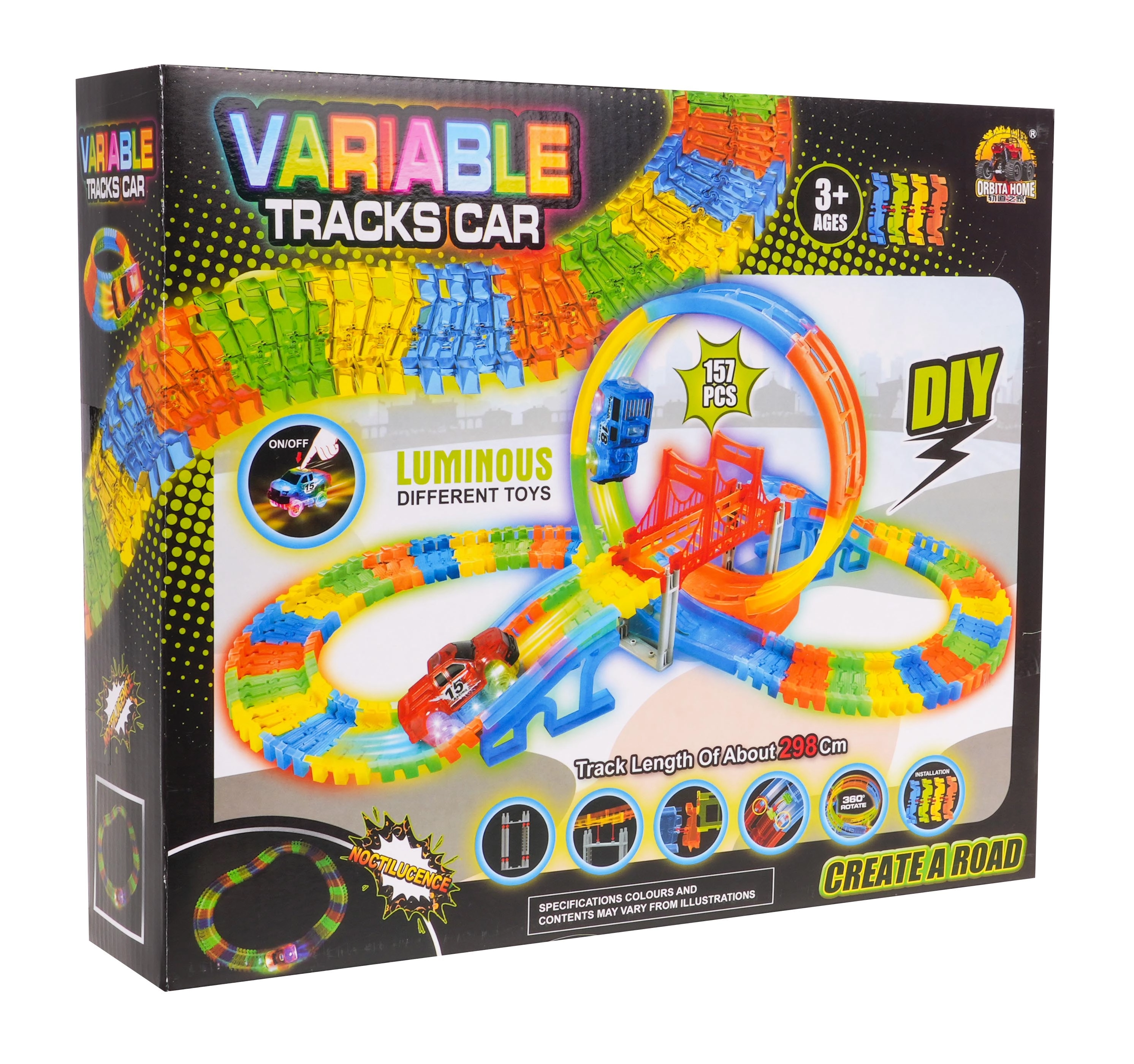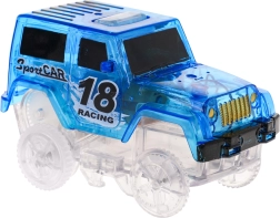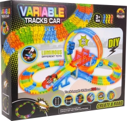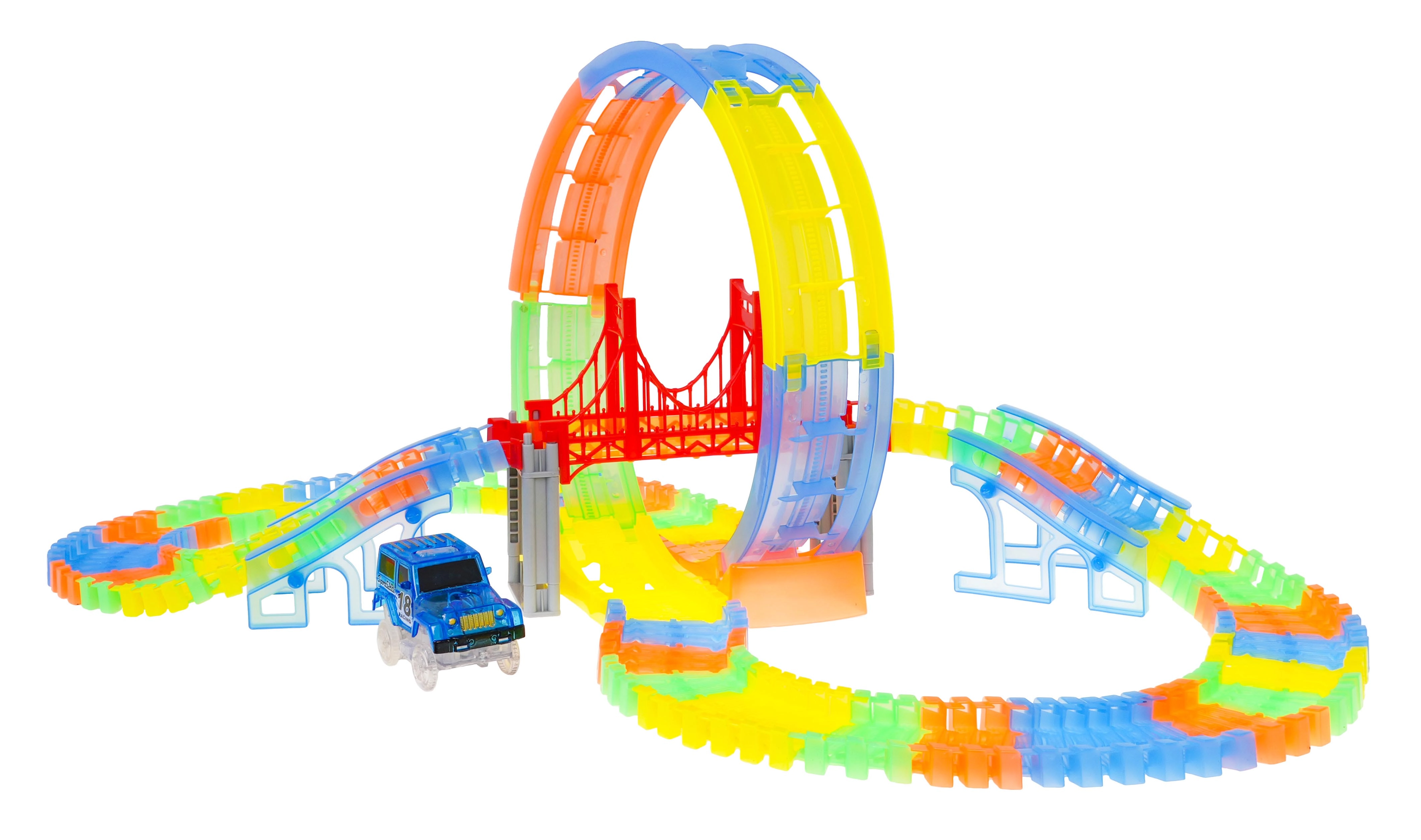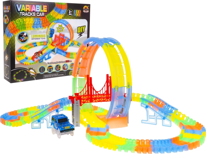 See värvikas võidusõidurada särab pimedas tänu fluorestseeruvatele osadele ja kaasas olevale LED-autokesele. Osad klõpsad lihtsalt kokku, saad neid pöörata, tõsta ja ümber paigutada ka sõidu ajal, luues uusi radasid koos 360° silmuse, sildade ja rampidega. Vaja on vaid vajutada nuppu auto katusel ja võidusõit võib alata!