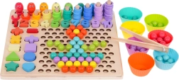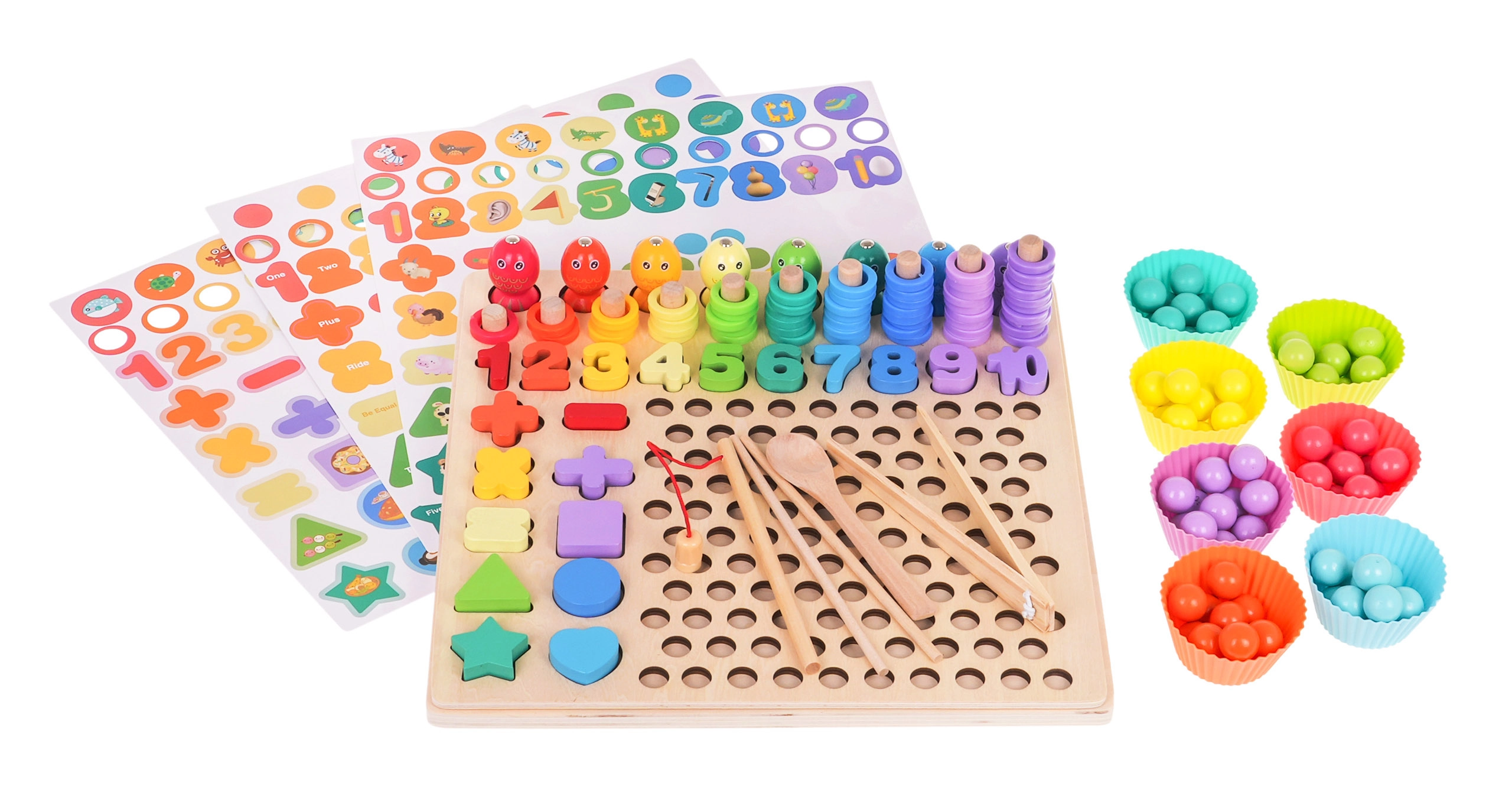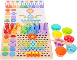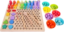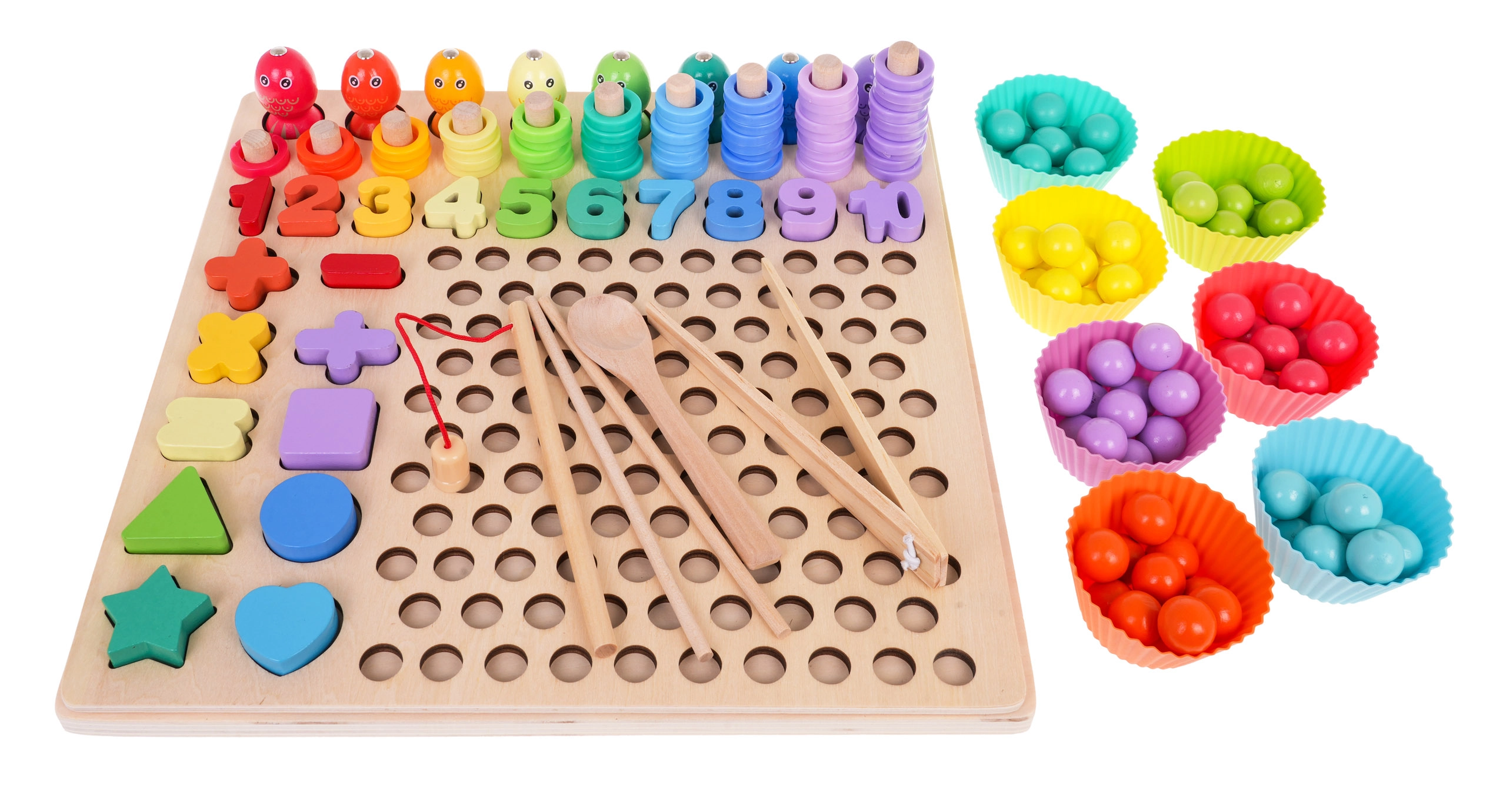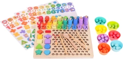 See värviline puidust hariduskomplekt pakub lastele kümneid mänguvõimalusi: kalakeste püüdmine magnetõngega, rõngaste lükkimine pulkadele ja lugemine, numbrite 1–10 sobitamine, lihtsate tehete koostamine ning kujundite ja värvide äratundmine. Silikoonist topsid ja puidust helmed koos pintsettide, lusika ja pulkadega arendavad suurepäraselt haaret ja täpsust.