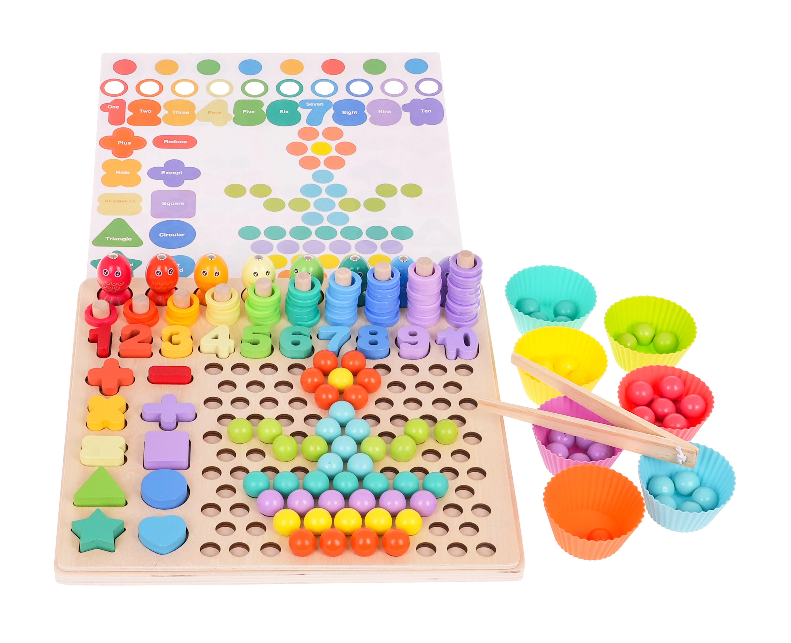 Puidust pulgad rõngastega, numbrimärgid ja matemaatilised sümbolid õpetavad mängu kaudu matemaatika aluseid: hulga võrdlemist, lihtsaid tehteid ja numbrite äratundmist.