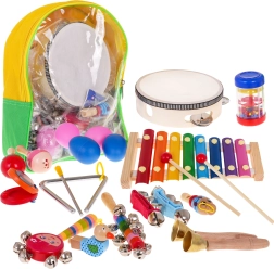 Avastage kirju puidust muusikakomplekt lastele alates 2. eluaastast koos praktilise läbipaistva seljakotiga. Komplektis on 22 värvikirevat pilli, sh ksülofon, tamburiin, marakad, triangel, kuljused ja munakujulised shakerid. Ohutud materjalid, vastupidav teostus ja rohked helid toetavad meelte arengut, rütmitaju ning peenmotoorikat – ideaalne esimeseks muusikaliseks avastamiseks kodus ja teel.
