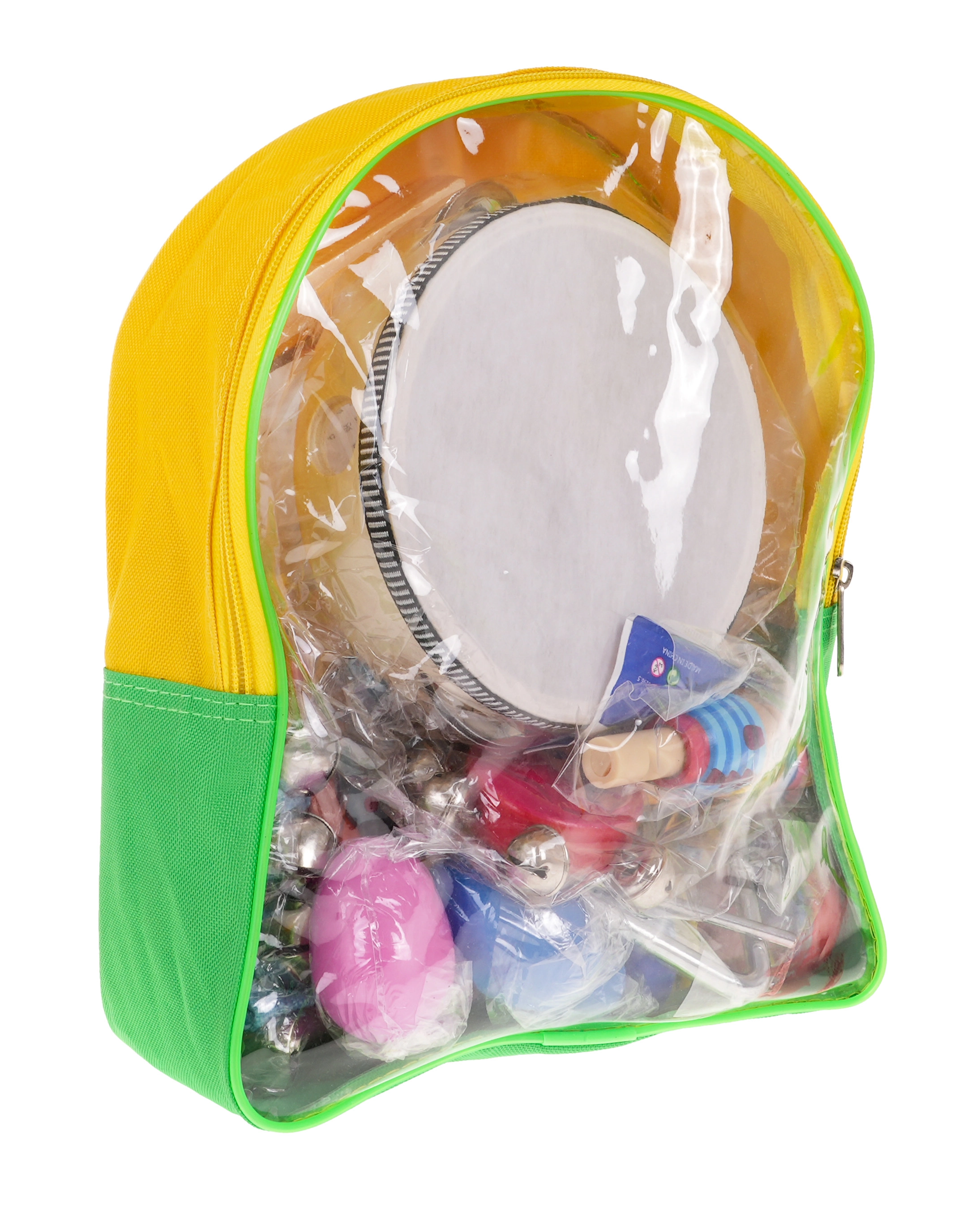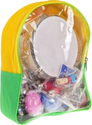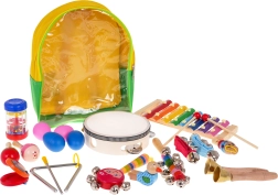 See rikkalik muusikakomplekt toob lastele rõõmu helide ja rütmide avastamisest. Puidust ja metallist elemendid on vastupidavad ja värvilised, toetades tähelepanu ning keskendumist. Kõik on lihtne paigutada läbipaistvasse seljakotti, mida on mugav kanda ja mis hoiab korra majas.