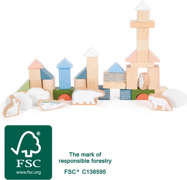 - Värvilised ja naturaalsed klotsid, 5 loomafiguuri (jääkaru, lumekakk, polaarrebane, hüljes, jänes), 2 jääpanka