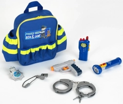 Avastage Saksamaa tunnustatud kaubamärgi Kleini lõbus politseiseljakott BEN & SAM – täiskomplekt väikesele korravalvurile. Komplektis on seljakott helkurelementidega, toimiv taskulamp, lühilaine raadiosaatja (imitatsioon), vile, politseimärk, plastkäerauad ja veepüstol. Tänu mitmele taskule ja vastupidavale teostusele on mänguasjade kiire, ülevaatlik ja ohutu pakkimine tagatud.