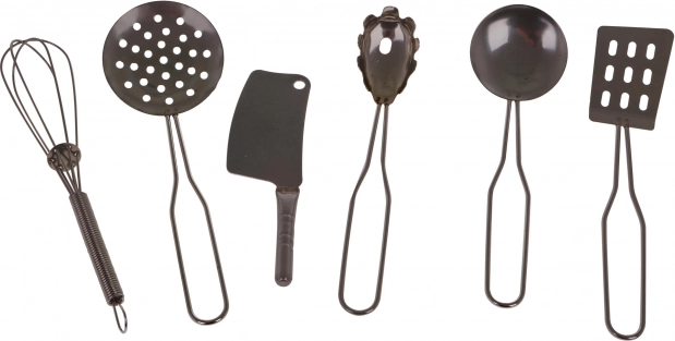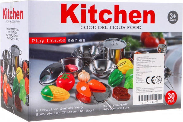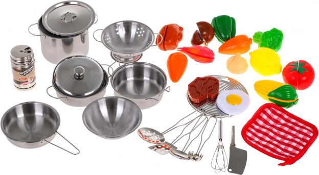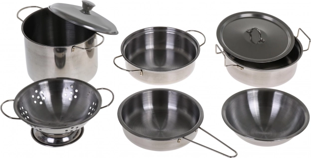 Sisaldab erinevaid kööginõusid, sealhulgas roostevabast terasest potte, panne ja kausse realistlikuks mänguks.