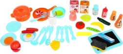 Komplekt sisaldab rikkalikku valikut tarvikuid, sh potid, taldrikud, lusikad ja mängutoit, mis võimaldab lõputuid mänguvõimalusi.