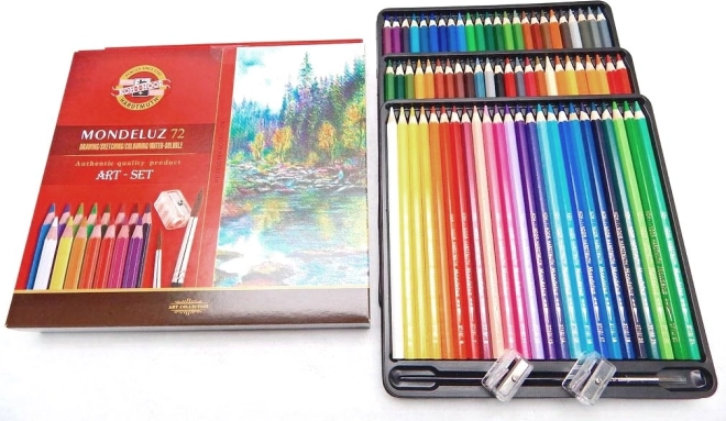 Professionaalsed akvarellpliiatsid KOH-I-NOOR Mondeluz, komplektis 72 tükki, pakuvad laia valikut sügavaid ja valguskindlaid toone. Neid on lihtne veega hajutada, võimaldades täiuslikke akvarelliefekte. Pakendis on 3 pintslit ja 2 teritajat täielikuks loomekogemuseks.
