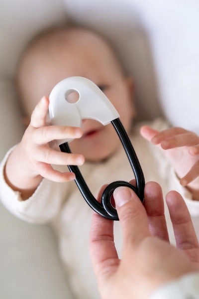 Klassikaline laste kõrin prossinõela kujuga on ideaalne beebi esimesteks haaramiskatseteks. See on kerge ja kontrastne, mis stimuleerib lapse tähelepanu.