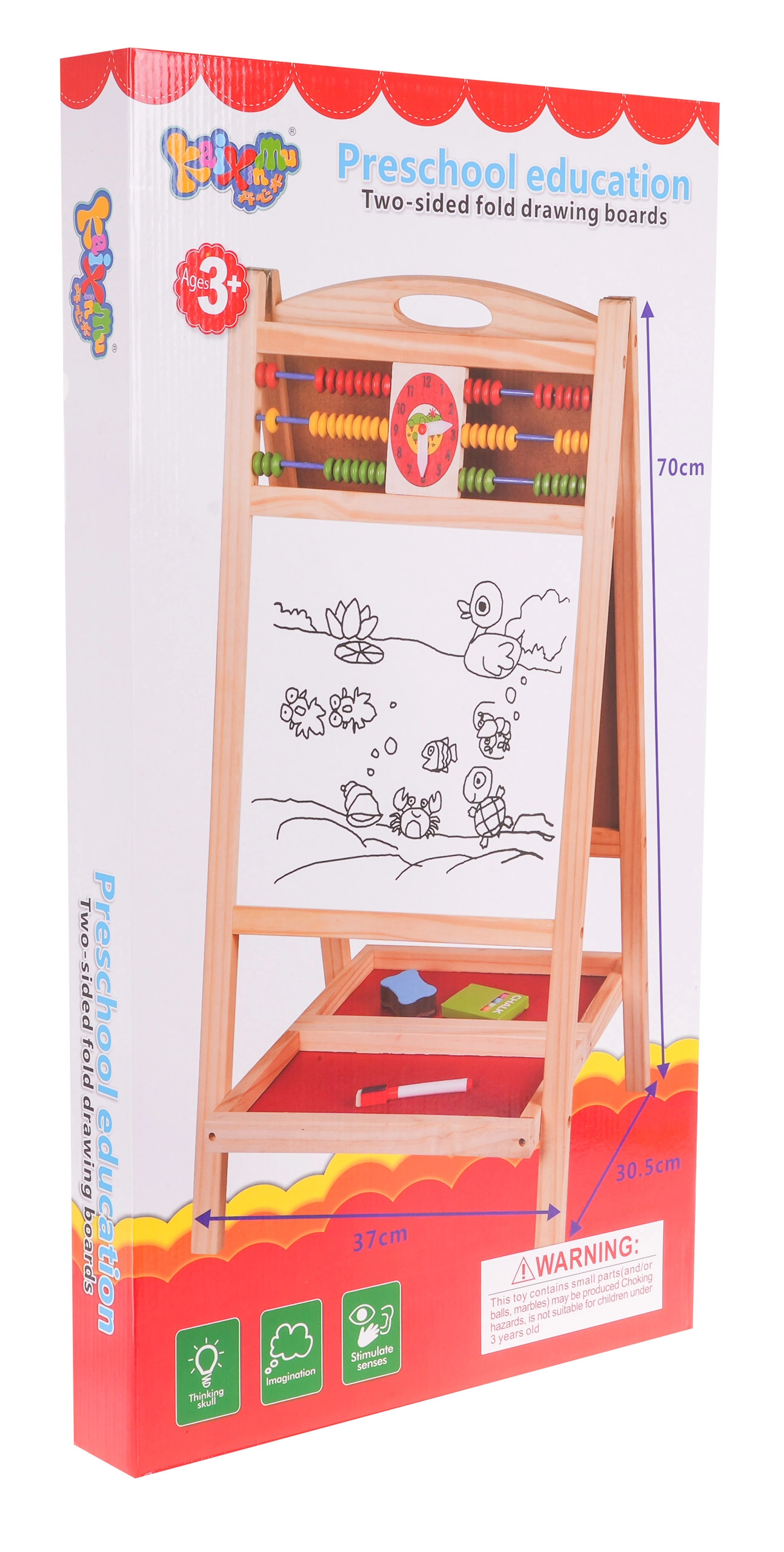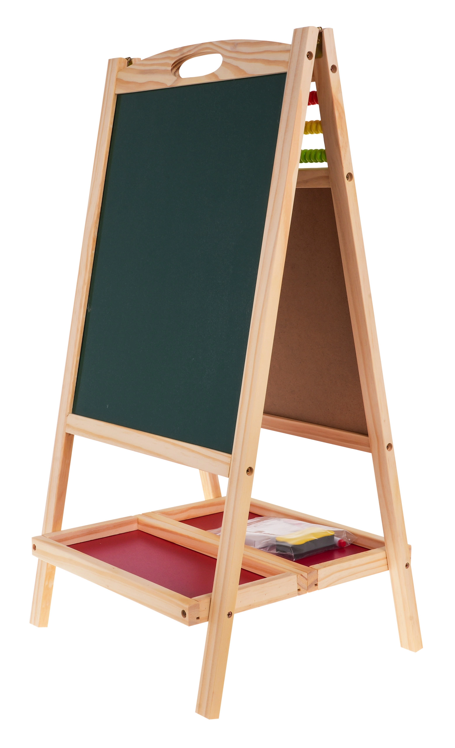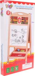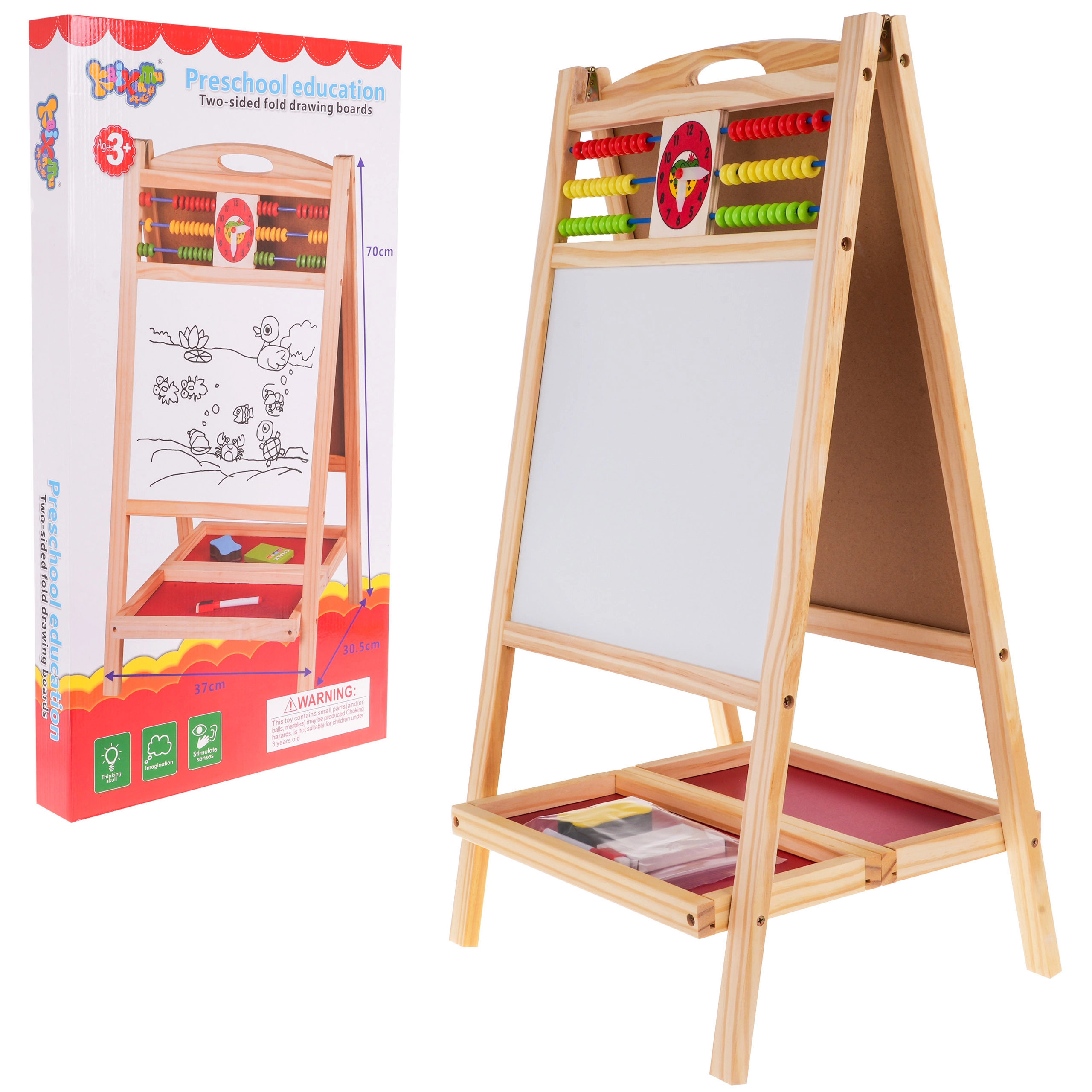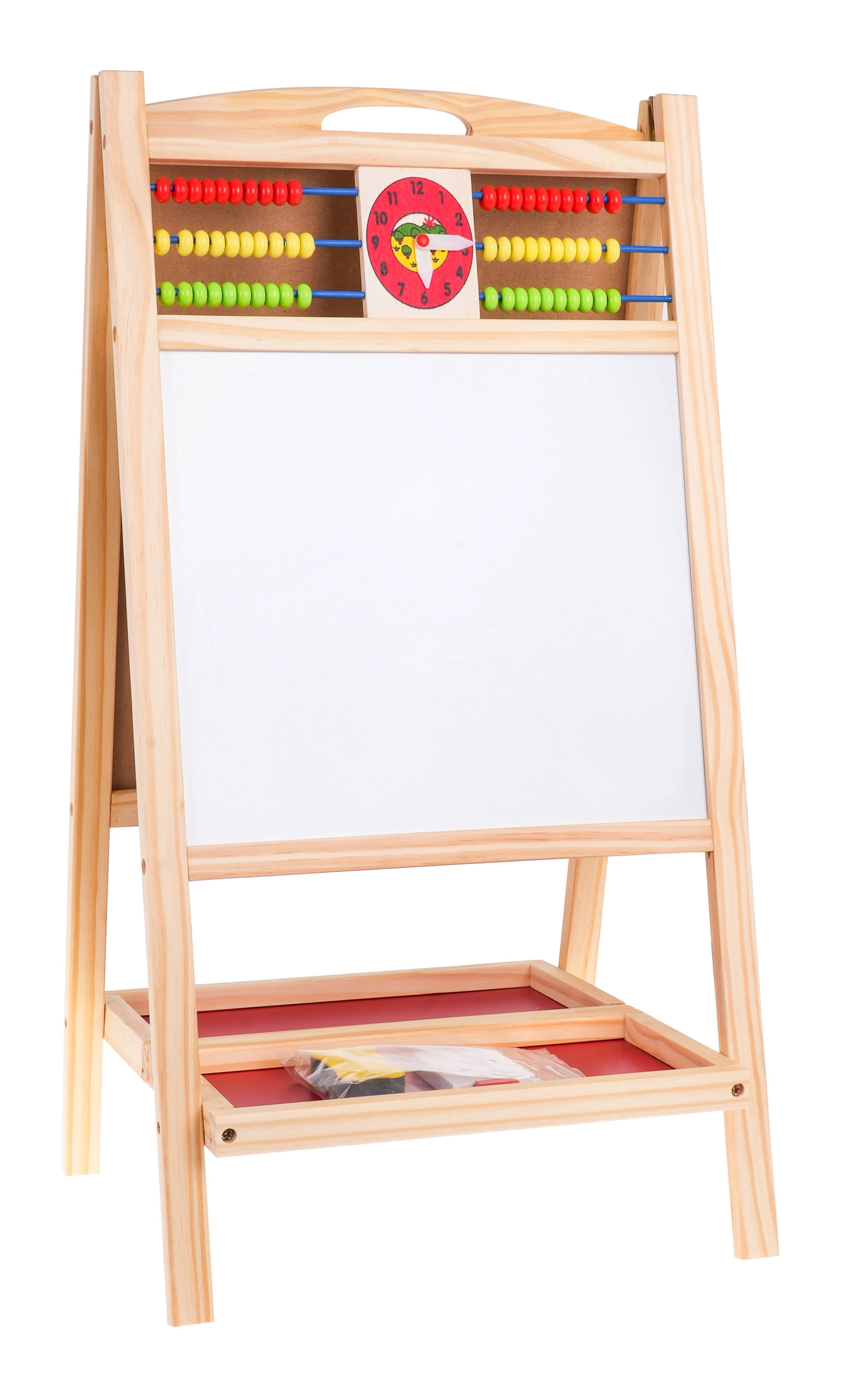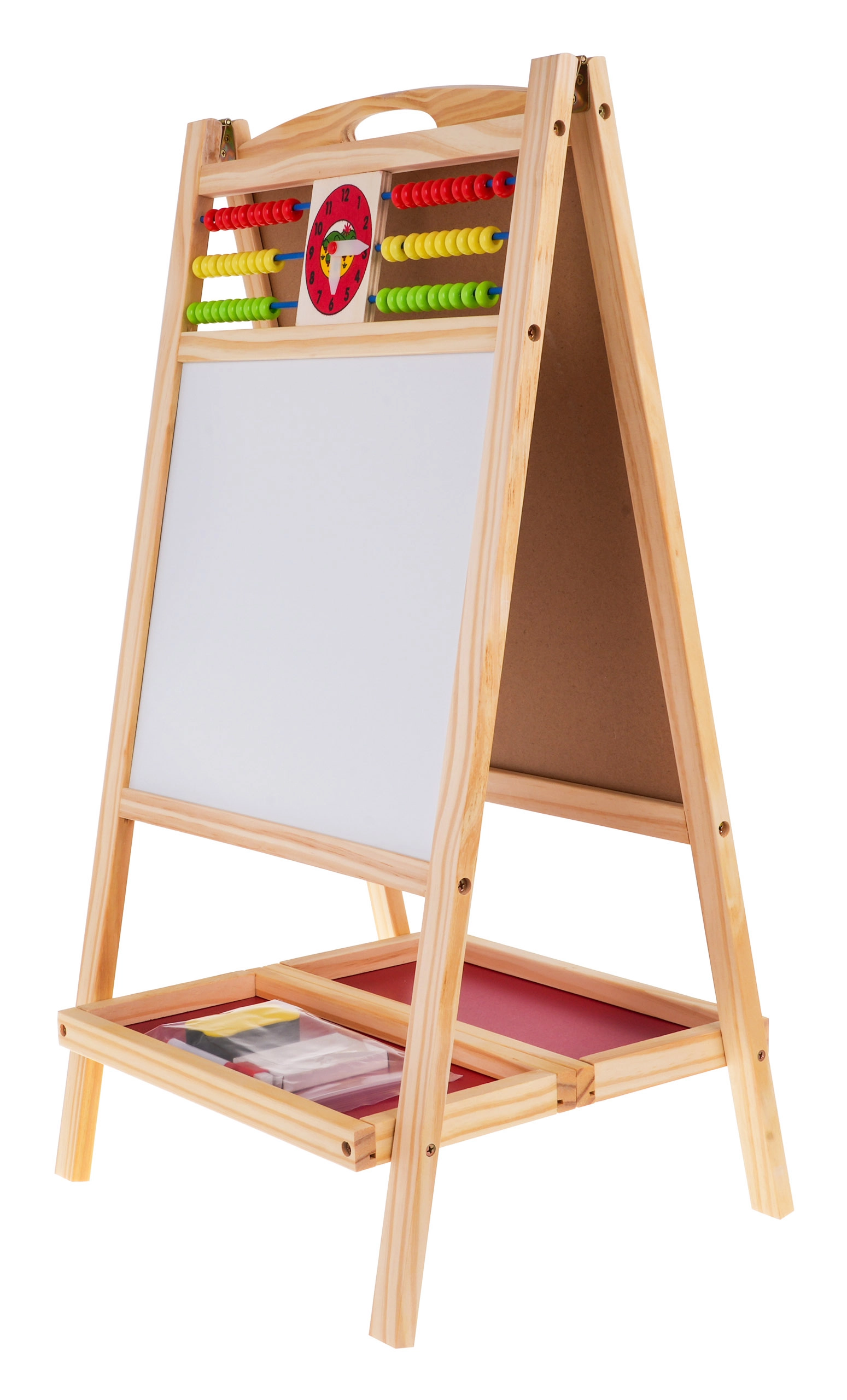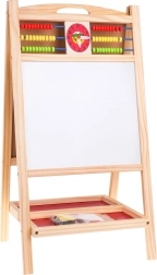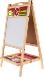 Praktiline ja stabiilne puidust tahvel lastele alates 3. eluaastast pakub ühel pool magnetilist valget pinda markeriga kirjutamiseks ja teisel pool kriiditahvlit. Ülaservas on loendamispulgad ja kell liikuvate seieritega mängulise õppimise jaoks. Komplektis on magnetiline marker kustutuskummiga, värvilised kriidid, svamm ning kahekordne hoiuriiul. Suurepärane peenmotoorika, loovuse ja kontsentratsiooni arendamiseks.