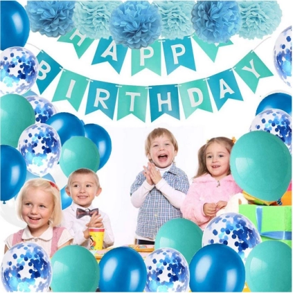 Stiilne türkiissiniste ja siniste toonidega sünnipäevakaunistuste komplekt loob laste peol unustamatu meeleolu. Komplektis on õhupallid, paberist pompomid ja HAPPY BIRTHDAY girland. Õhupalle saab täita õhu või heeliumiga – heeliumiga leijuvad need kaunilt. Ideaalne nii sise- kui välispeoks ning fotoseina loomiseks mälestusfotode jaoks.