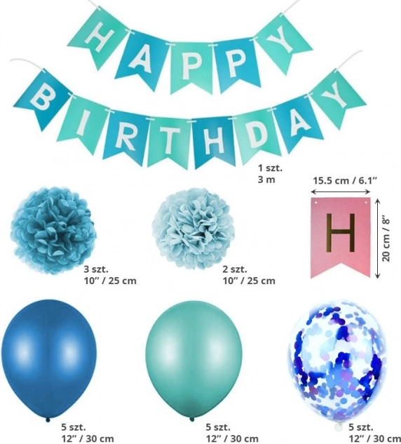 - 3× helesinine pompom, 3× sinine pompom, 5× konfettidega õhupall, 5× rohelised õhupallid, 5× sinised õhupallid, 1× HAPPY BIRTHDAY kiri