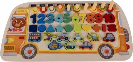 See multifunktsionaalne 6-ühes puidust komplekt on ideaalne valik eelkooliealistele. Lapsed harjutavad mängides värvide ja kujundite äratundmist, õpivad numbreid ja põhimaatemaatikat ning parandavad manuaalseid oskusi tänu rõngaste lükkimisele või kalade püüdmisele magnetõngega.