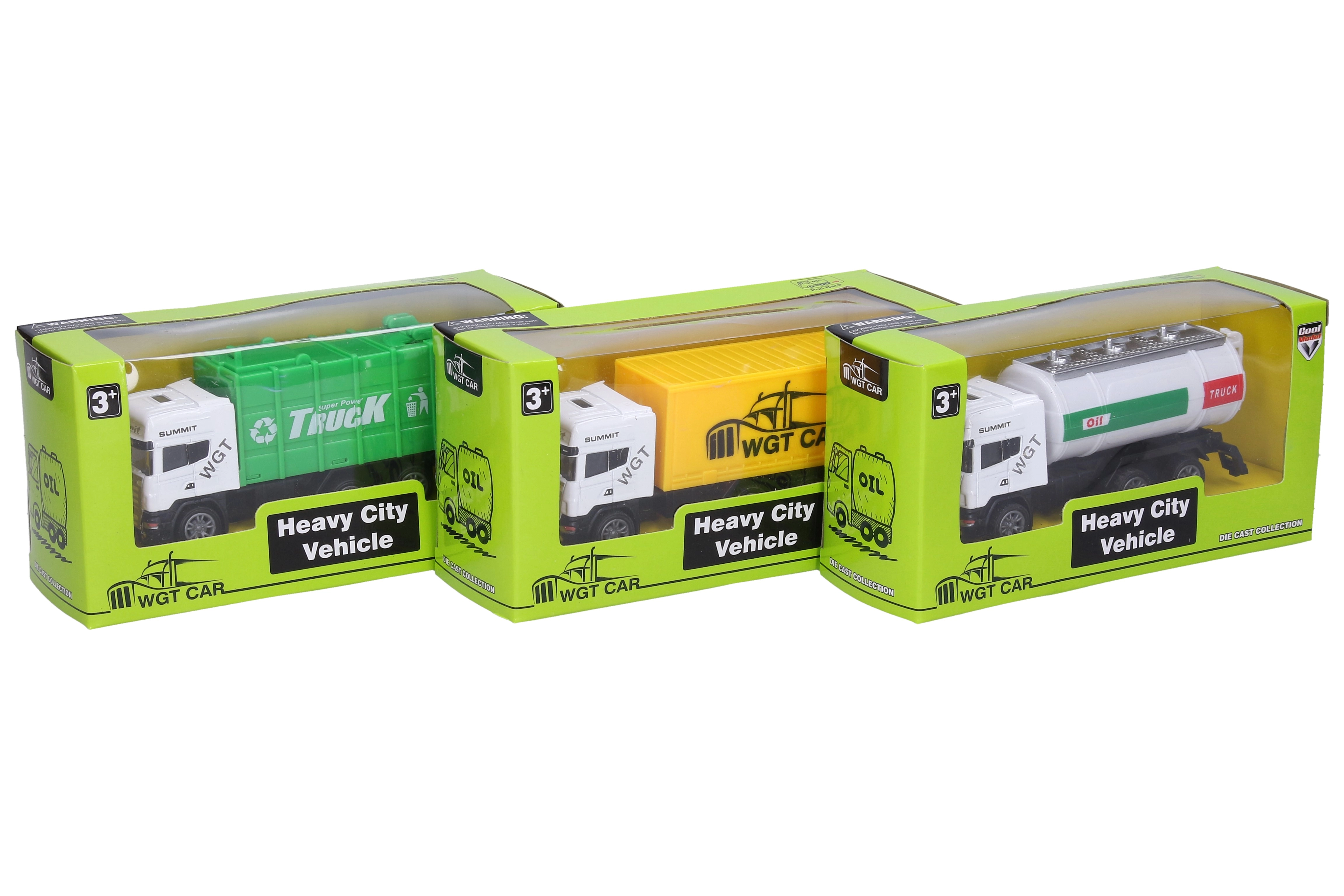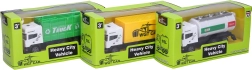 Lõbus metallist auto pikkusega 11,5 cm koos tagasiveomehhanismiga kiireks sõiduks. Saadaval 3 varianti: veok, tsistern ja prügiauto.