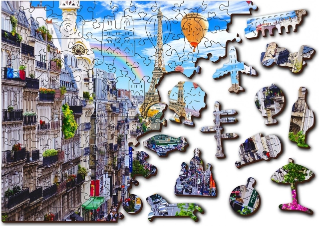 WOODEN CITY puidust pusle Sagin Pariisis on ainulaadne oma kahepoolse ülesehituse ja erikujuliste tükkide poolest, mis muudavad stseeni kokkupanemisel elavamaks. Kokkupanek on väljakutsuvam eri kujuga tükkide tõttu, kuid samas lõbusam. See pakub pinget ka kogenud puslesõpradele.