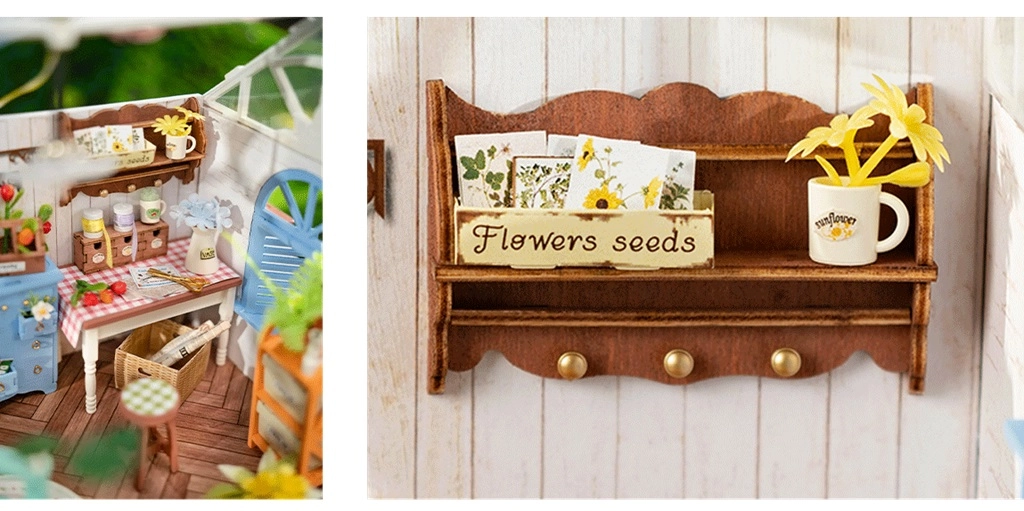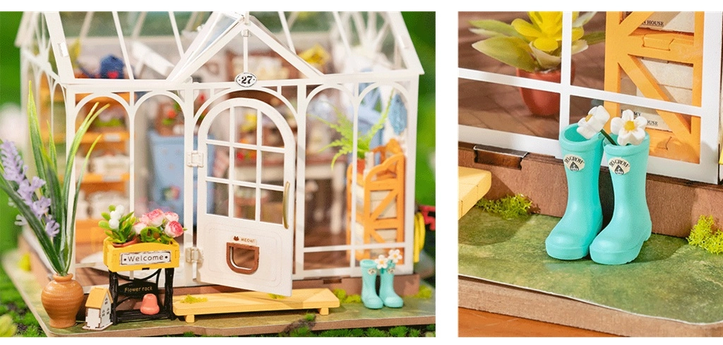 See kasvuhoone mudel on teostatud hämmastava täpsusega, sisaldades pisikesi dekoratiivesemeid ja aiatööriistu, mis annavad mudelile realistliku ilme.