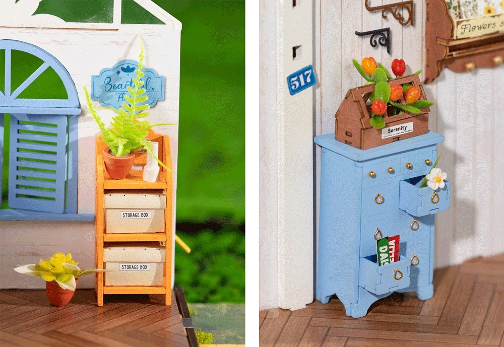 Mudeli interjöör on rikkalikult varustatud miniatuursete mööbliesemete, taimede ja lisanditega, muutes selle teie kodu jaoks ideaalseks dekoratsiooniks.