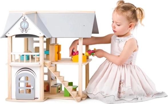 See kaunilt viimistletud nukumaja on ideaalne täiendus lastetuppa. Mõõtudega 53 x 32,5 x 51 cm pakub see piisavalt ruumi kaasasoleva mööbli paigutamiseks. Nukumaja on valmistatud naturaalsest puidust pastellsete aktsentidega ja sobib lastele alates 3. eluaastast.