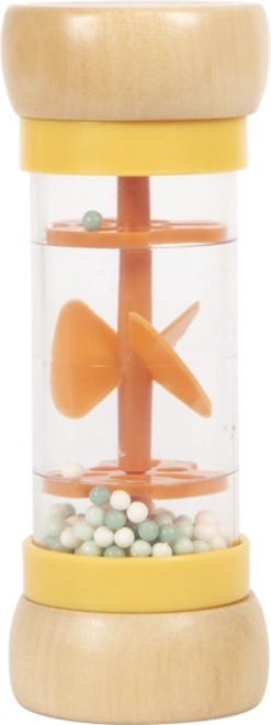 Naudi õrna vihma rahustavat heli Small Footi vihmakepiga, mis arendab laste kuulmis- ja nägemistaju. Läbipaistev korpus kuulikeste ja pöörleva propelleriga köidab kohe pilku, toimib nii kõrinana kui ka rütmimänguasjana ning on väikestele kätele hõlpsasti haaratav. Ideaalne reisele, sobib alates 6. elukuust. Kõrgus 14 cm, Ø 5 cm; materjal: puit ja plast.