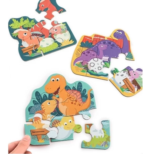 Avastage lõbu lastepuslega originaalses munakujulises pakendis. Komplekt sisaldab 3 eraldi puslet, igas 6 tükki, dinosauruste motiividega. Tükid on tagaküljelt sama mustri ja nummerdusega, et tagada lihtsam sorteerimine ja kiire kokkupanek. Plastist muna avaneb kergesti ning toimib praktilise hoiukarbina nii pusletükkidele kui ka väikestele aaretele.