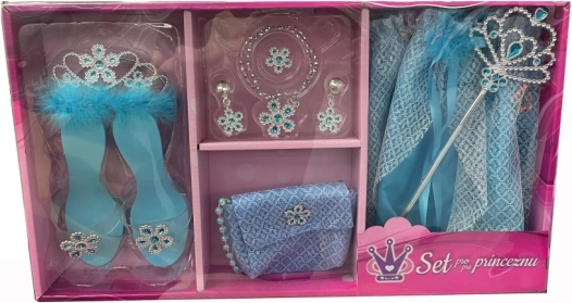 Täida iga väikese printsessi unistus selle printsessikomplektiga sinises värvitoonis. Komplektis on seelik, sandaalid, kroon, käekott, võlukepp ja ehted – kõik, mida on vaja võluva printsessimängu jaoks.