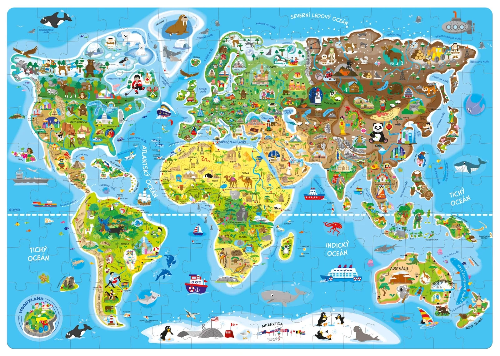Avasta maailma kodu mugavusest mänguliste pusledega nii lastele kui täiskasvanutele. Maailmakaardi geograafiapusle pakub ülevaadet mandritest, maailma vaatamisväärsustest ja loomadest piirkonniti. Suurepärane nii meelelahutuseks kui õppeks, illustratsioonid Tšehhi kunstnikult.