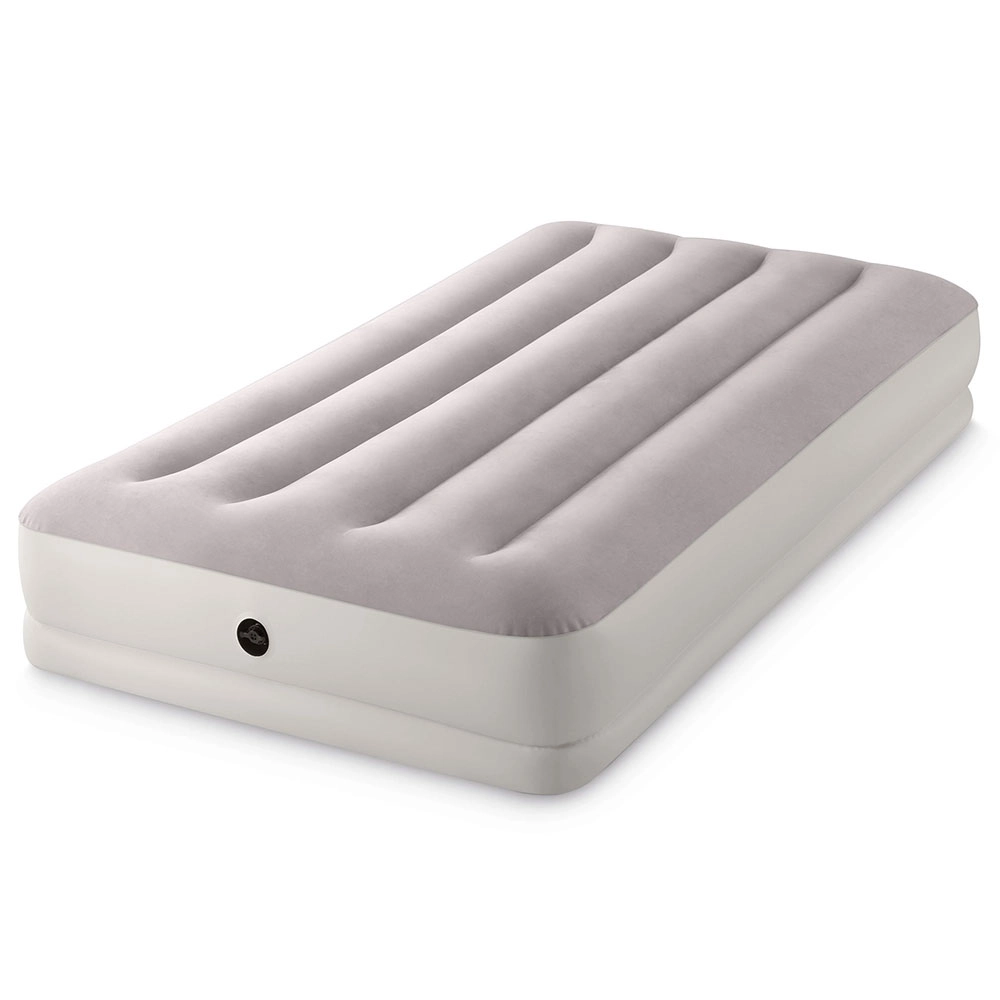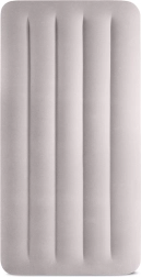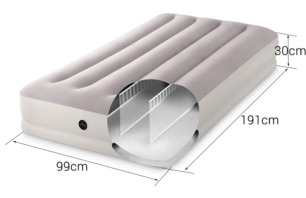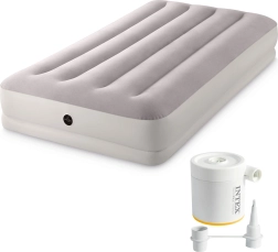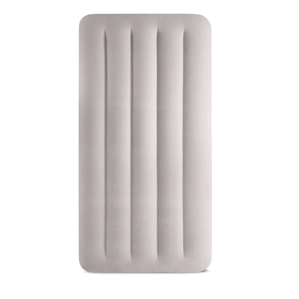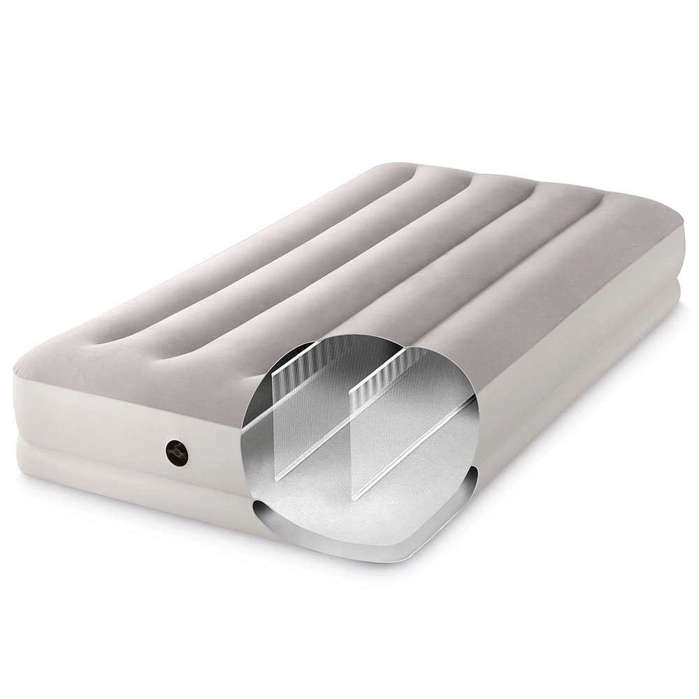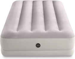 Täispuhutav voodi INTEX ühendab vastupidava PVC-materjali pehme flock-kattega pinnaga, mis on meeldiv puudutusele ja parandab une mugavust. Tõstetud konstruktsioon pikisuunaliste kambrite ja sisemiste tugevdustega tagab stabiilsuse ilma õõtsumise efektita ning usaldusväärse toe selgroole.