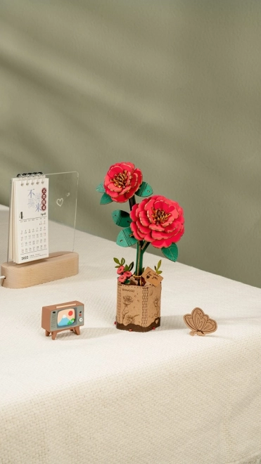 See elegantne 3D puidust pusle loob detailse punase kamellia mudeli lillepotis. Kvaliteetsest, keskkonnasõbralikust puidust detailid haakuvad täpselt ning valminud mudel sobib suurepäraselt stiilseks kaunistuseks lauale, riiulile või kabinetti.