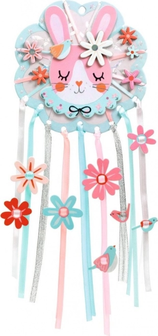 DIY unenäopüüdja Jänku DJECOlt on loominguline komplekt, mis on loodud kõige pisematele. Lapsed saavad kaunistada jänese pead kollaažitehnikas ning põimida värvilisi lilli värvilistele lintidele ja nööridele. Nii arendavad nad mitte ainult peenmotoorikat, vaid ka loovust ja kannatlikkust. Kogu valmistamine toimub ilma liimi ja kääride kasutamiseta.