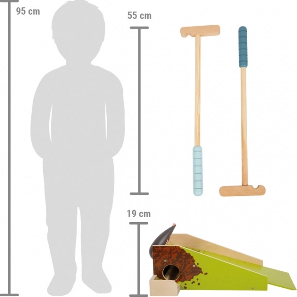 Avastage minigolfi võlu laste versioonis. Stabiilne puidust rada lõbusa „mutimäe“ ja haarava mehhanismiga reageerib igale täpsele löögile – pall läbib tunneli ja mutt pistab pea välja. Tänu kompaktsetele mõõtudele sobib mäng ideaalselt lastetuppa, elutuppa ja aeda.