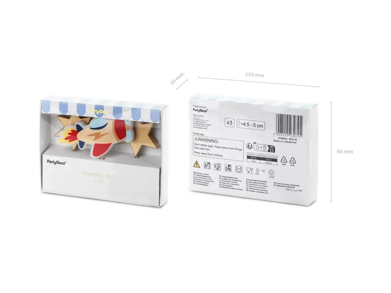 Need dekoratiivsed küünlad toovad rõõmu ja sära igale laste sünnipäevapeole. Komplektis on värvikirev raketikujuline küünal, mis paistab tordil silma kui lõbu keskpunkt. Mõlemal küljel on kaks kuldse tähe kujuga küünalt, mis lisavad peole kosmilise seikluse võlu.