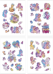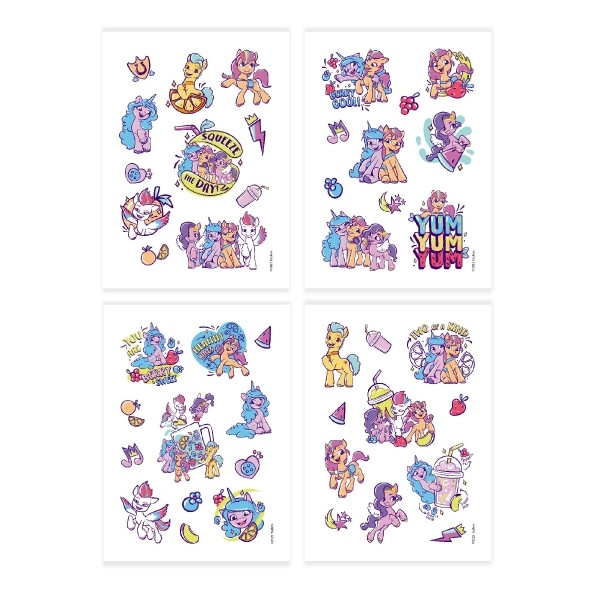 Avasta võluvate ponide maailm MY LITTLE PONY ajutiste tätoveeringute komplektiga. Iga 4 lehest toob mitmekesised ja armsad motiivid, mis rõõmustavad sarja fänne ja väikseid kunstnikke. Pealekandmine on kiire ja ohutu: vali pilt, aseta nahale, niisuta ja eemalda paber — valmis.