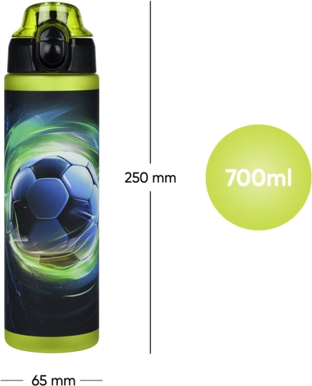 Stiilne jalgpallimuster ja külgmine mõõdurant vedelikutarbimise jälgimiseks. Ideaalne kooli, treeningule ja reisidele.
