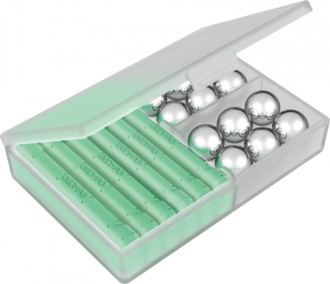 - 28× helendav magnetpulk, 28× metallkuul, 2× ruudukujuline alus, 2× viisnurkne alus, 3× hoiukast