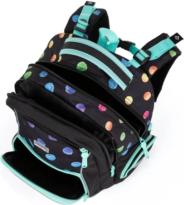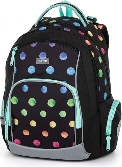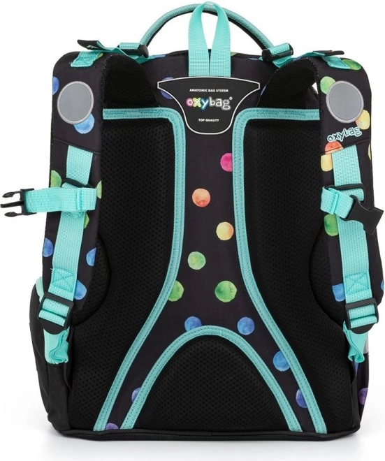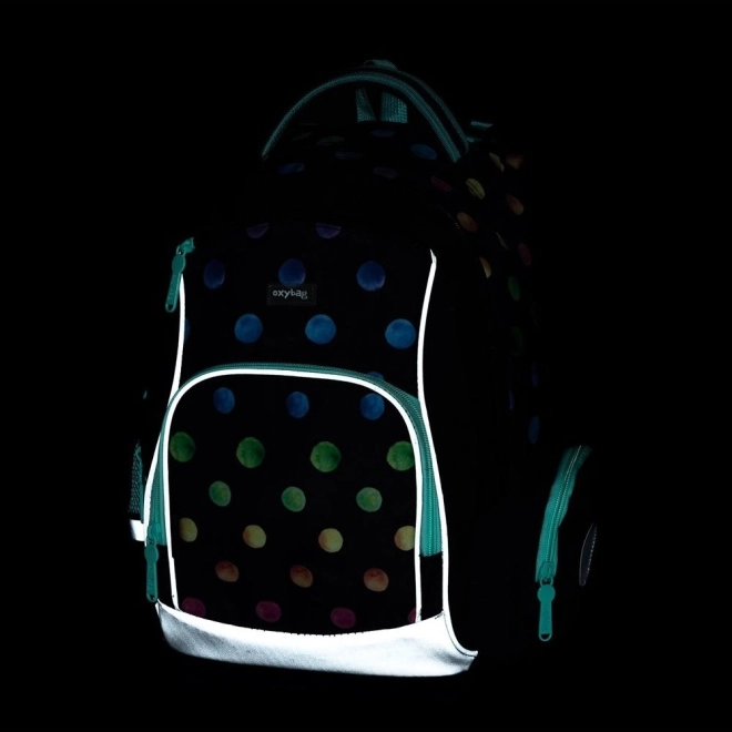 Oxybag OXY GO Dots koolikomplekt on loodud lastele alates 125 cm pikkusest ning pakub ideaalset mugavuse, vastupidavuse ja pilkupüüdva, mitmevärviliste täppidega disaini kooslust. Seljakott kaalub vaid 0,99 kg, sellel on jäik ja hingav seljaosa ning reguleeritavad õlarihmad tervislikuks ja mugavaks kandmiseks. Tänu helkurdetailidele on laps paremini nähtav ka kehvemates valgusoludes.