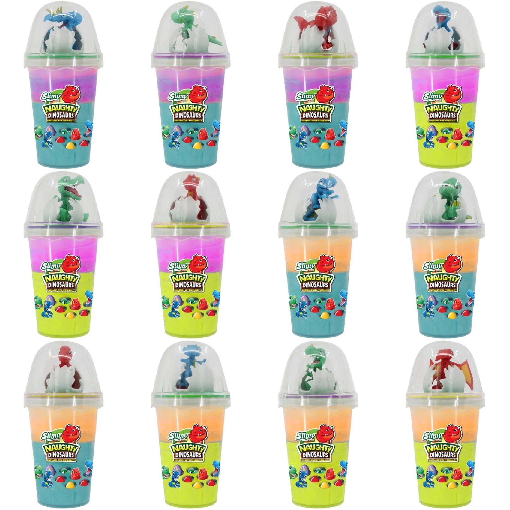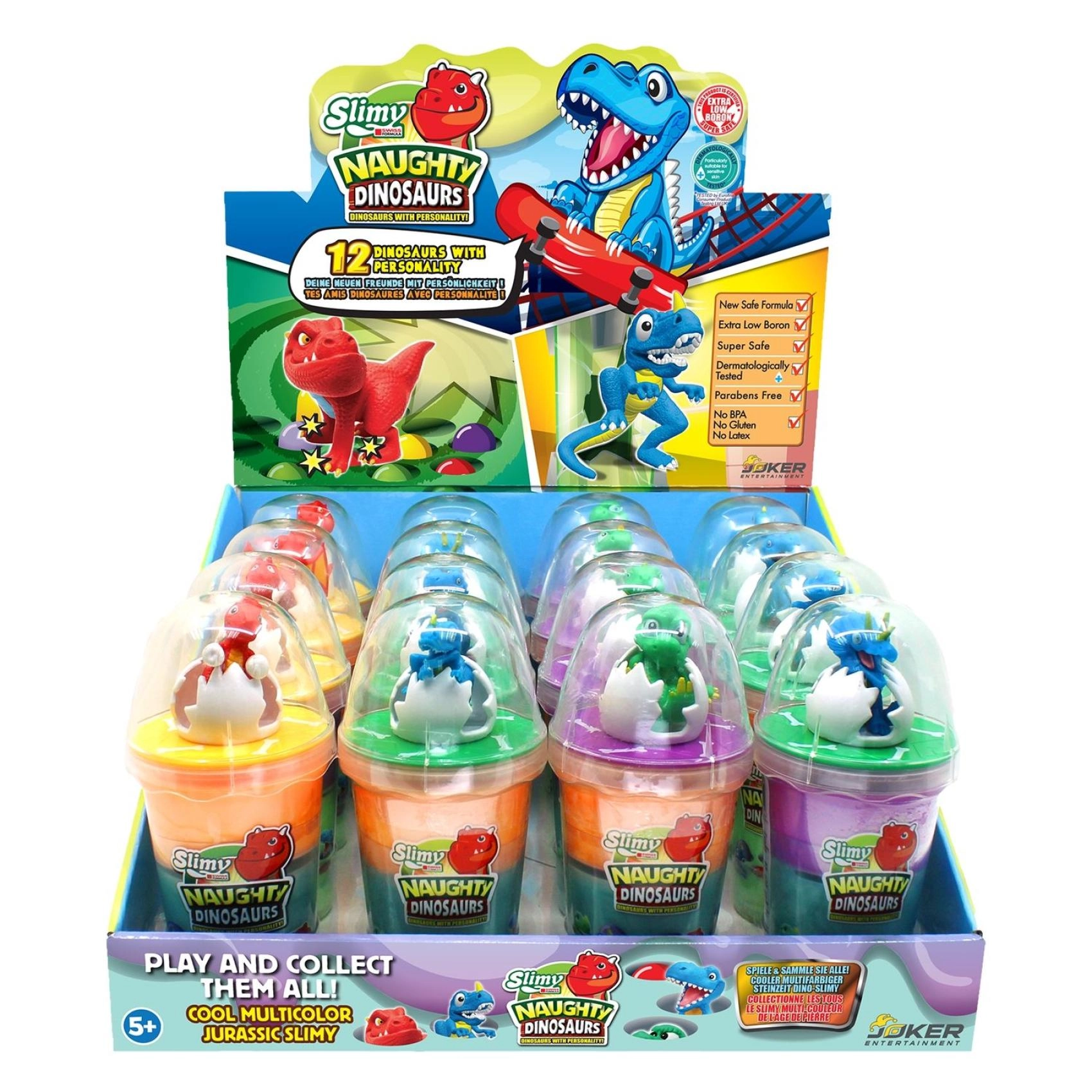 - 12 assortiid – kirevad limavärvid ja erinevad dinosaurusfiguurid.