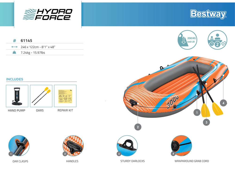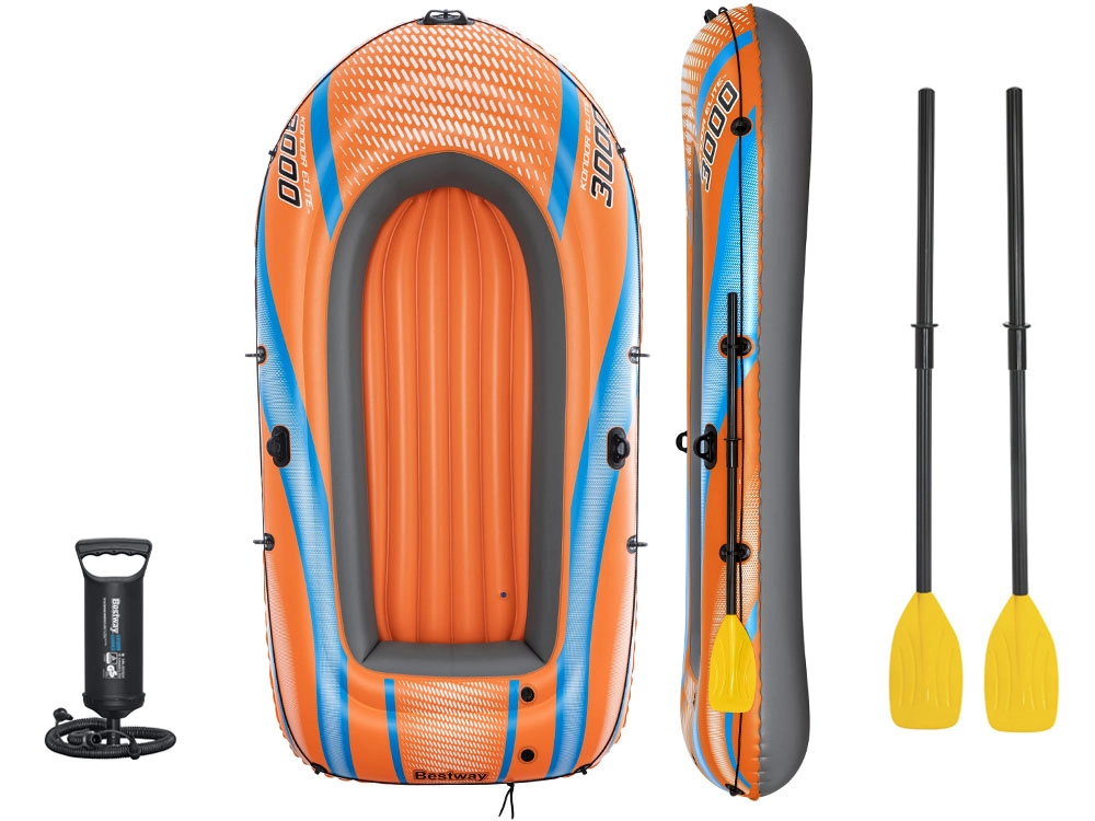 Täispuhutav paat BESTWAY Condor Elite 3000 on suurepärane valik rahulikul veel lõõgastumiseks, järvel puhkamiseks ja pereväljasõitudeks. Tänu vastupidavale PVC-materjalile ja läbimõeldud konstruktsioonile pakub see stabiilsust, ohutust ja mugavust. Maksimaalne kandevõime 200 kg võimaldab mugavalt sõita kahel täiskasvanul või lapsega vanematel.
