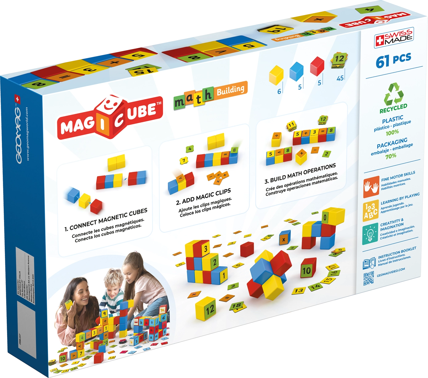 Geomag Magicube matemaatiline komplekt ühendab lõbu ja õppimise. Magnetkuubikud tõmbuvad üksteise poole igalt küljelt, nii et lapsed saavad hõlpsalt ehitada kujundeid, torne ja lihtsamaid 3D-konstruktsioone ning samal ajal harjutada arvutamist. Tänu kahepoolsetele numbrite ja sümbolitega klambritele saavad nad mänguliselt harjutada liitmist, lahutamist ja korrutustabelit.